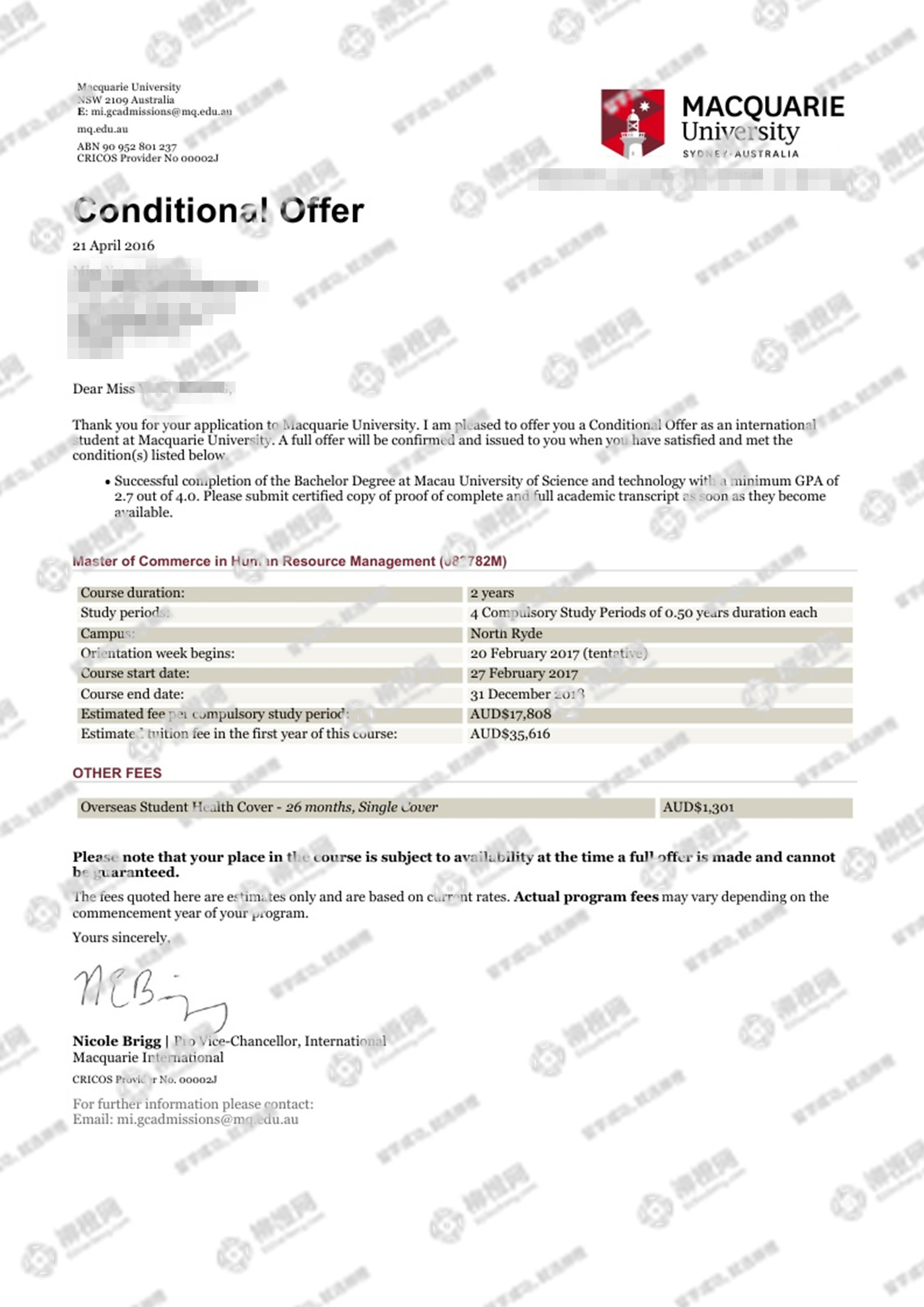 澳门科技大学人力资源专业的郑同学,在柳橙网的帮助下获澳洲麦考瑞大学offer。