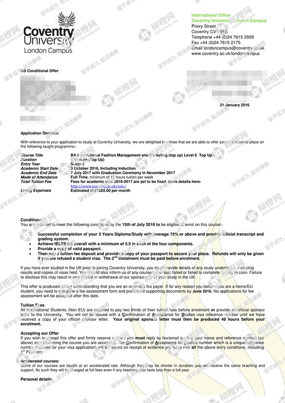 北京服装学院服装设计专业的陆同学,在柳橙网的帮助下获考文垂大学offer。