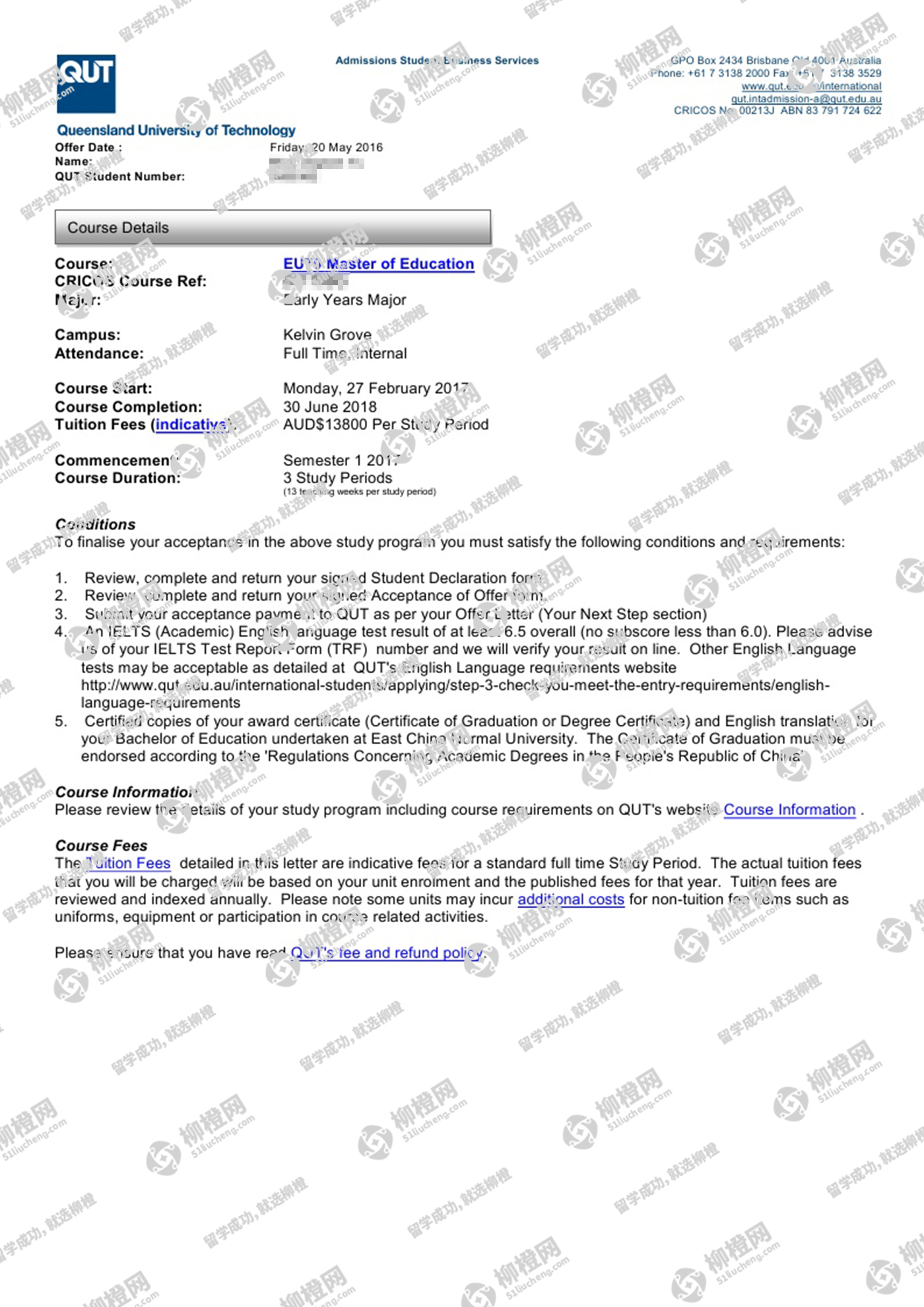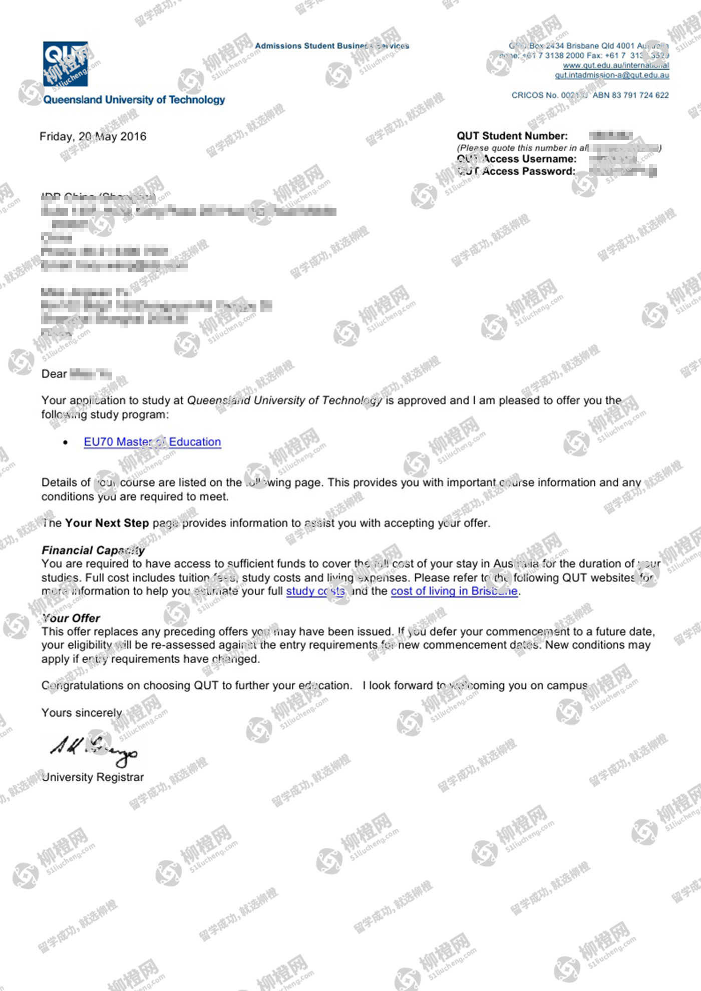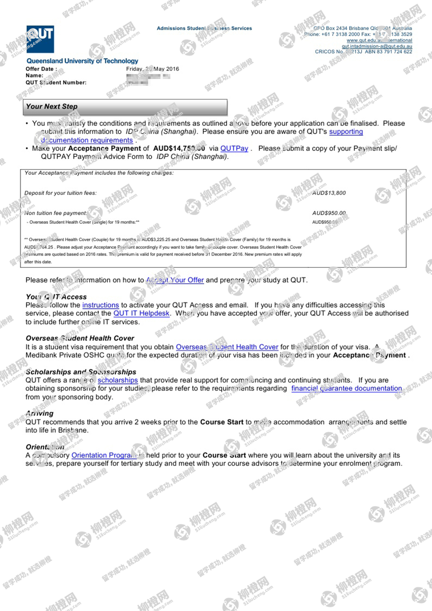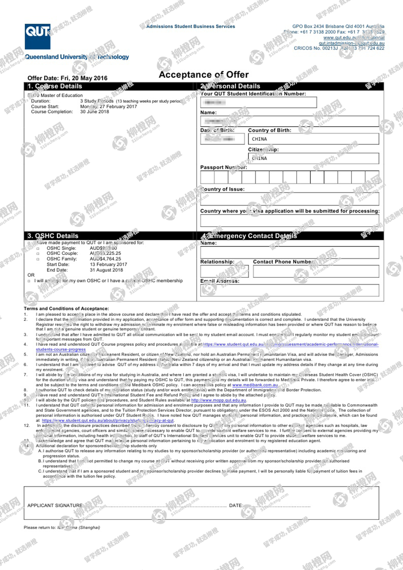 上海工商外国语职业学院德语专业的于同学,在柳橙网的帮助下获昆士兰理工大学offer。