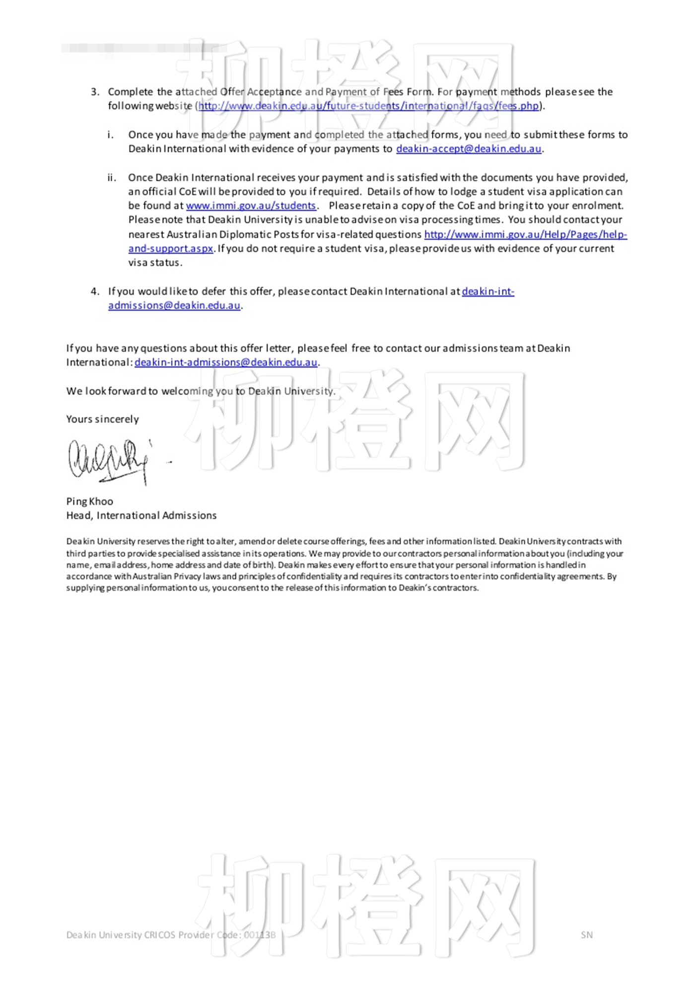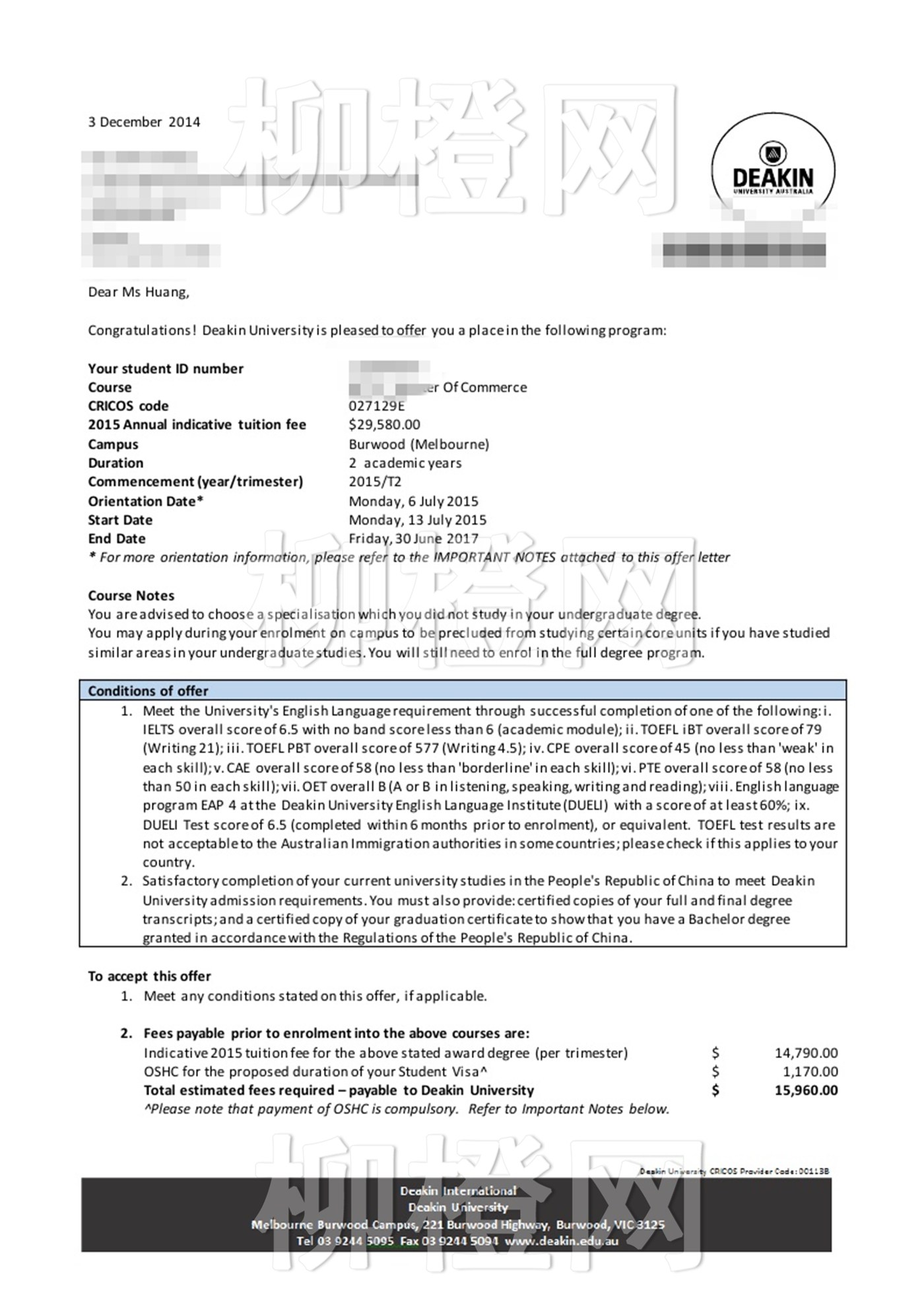 黄同学福州大学至诚学院财务管理专业均分72在柳橙网成功申请到了澳大利亚迪肯大学的Master of Commerce