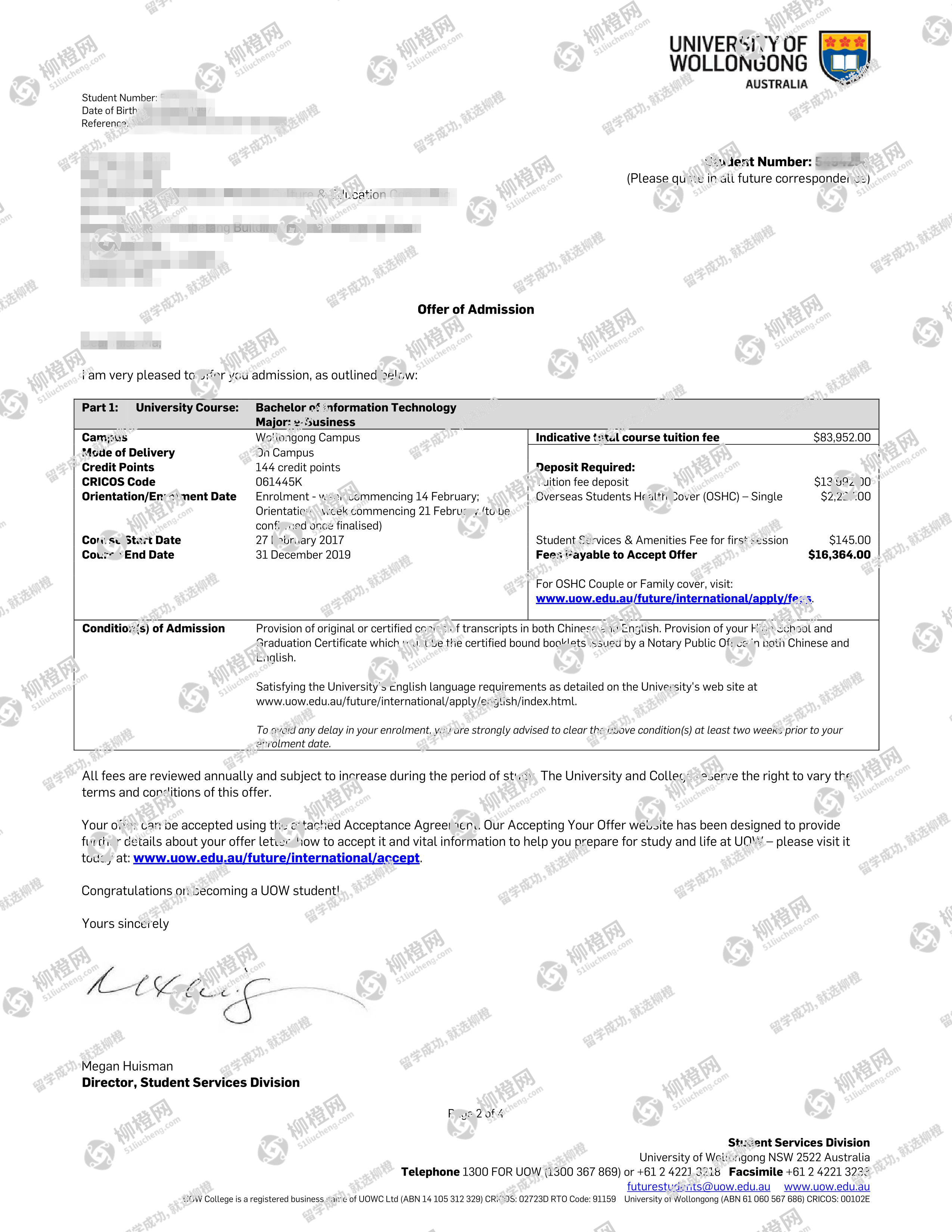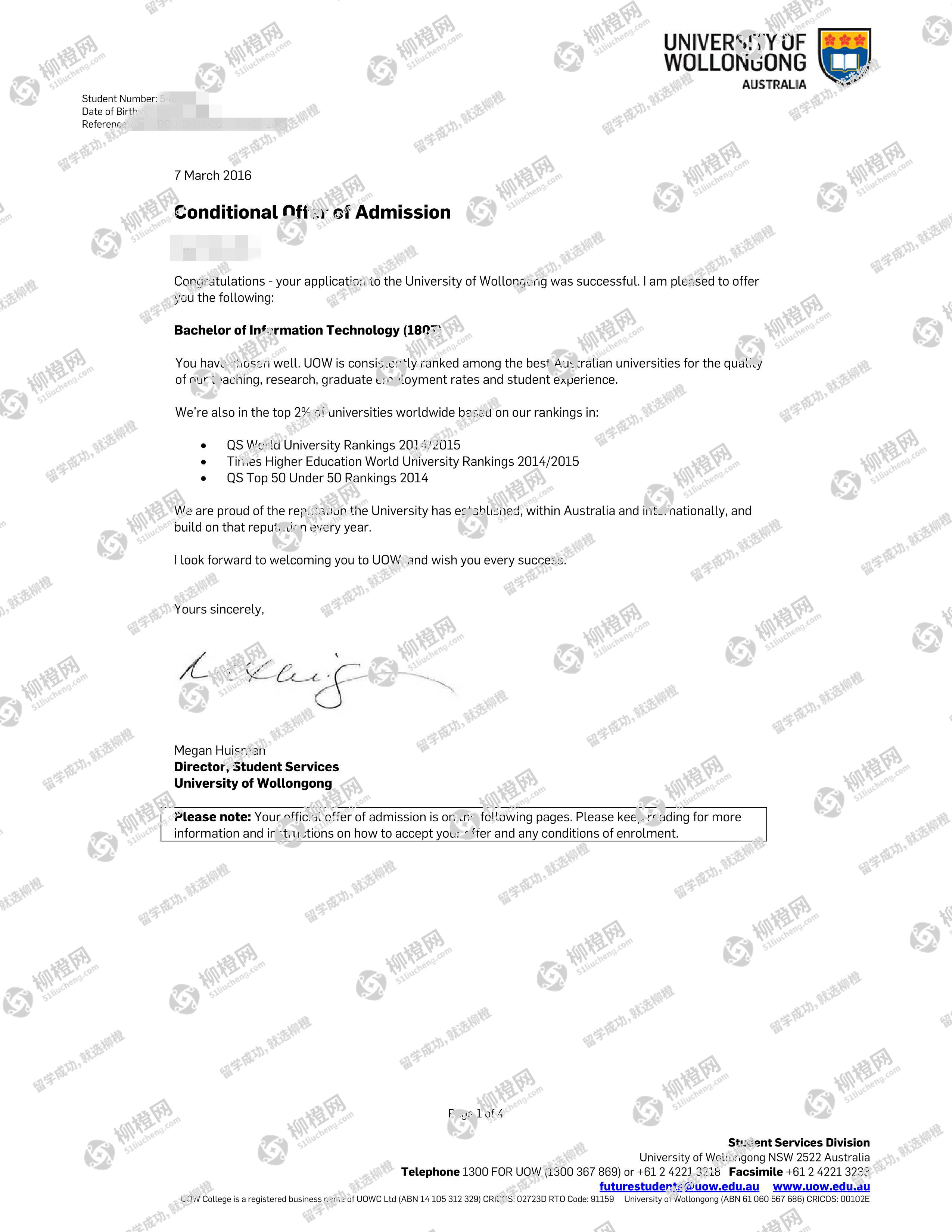 长春金融高等专科学校计算机应用技术专业的马同学,在柳橙网的帮助下获卧龙岗大学offer。