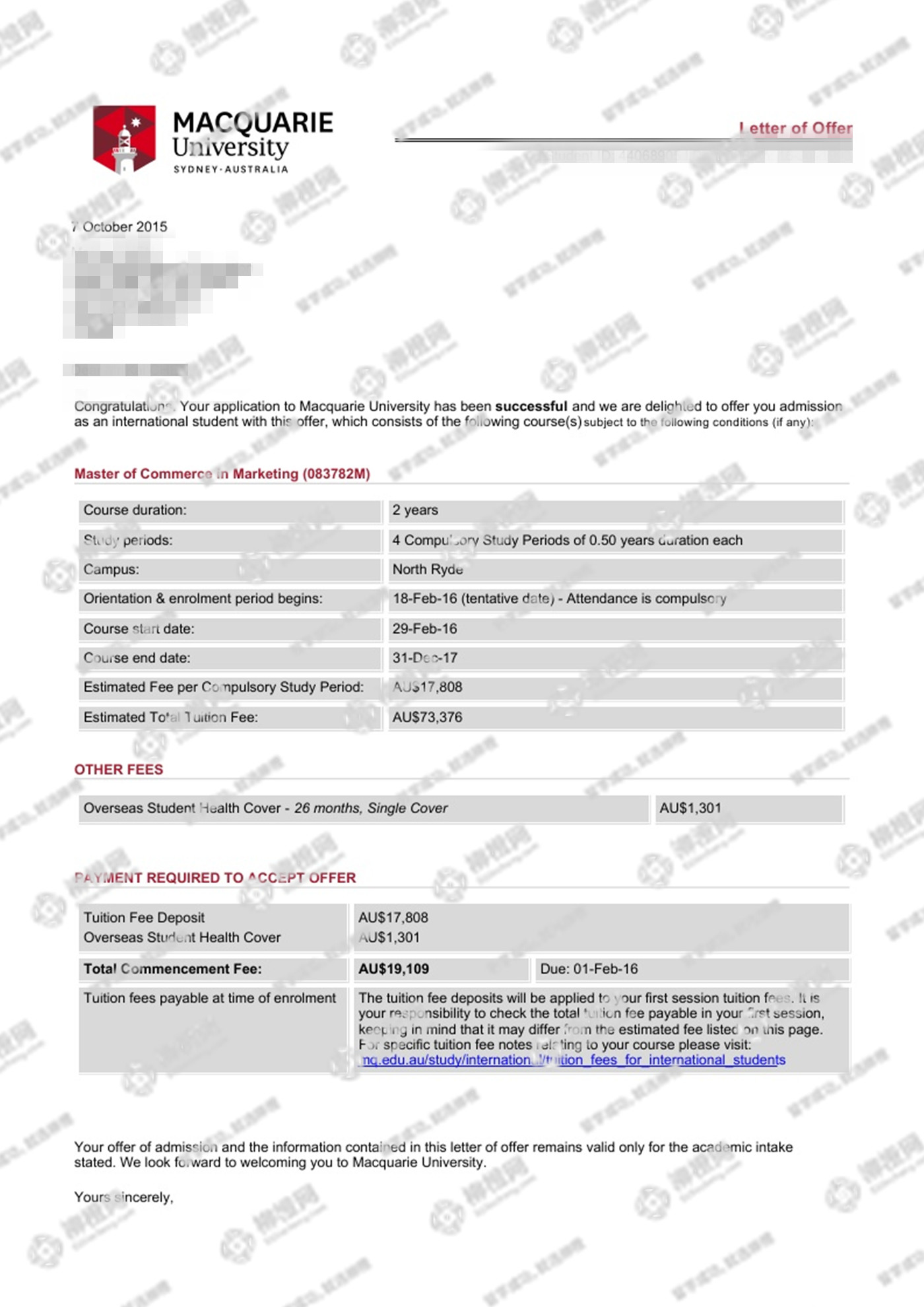 university of Liverpool,marketing专业的陈同学,在柳橙网的帮助下获澳洲麦考瑞大学offer。