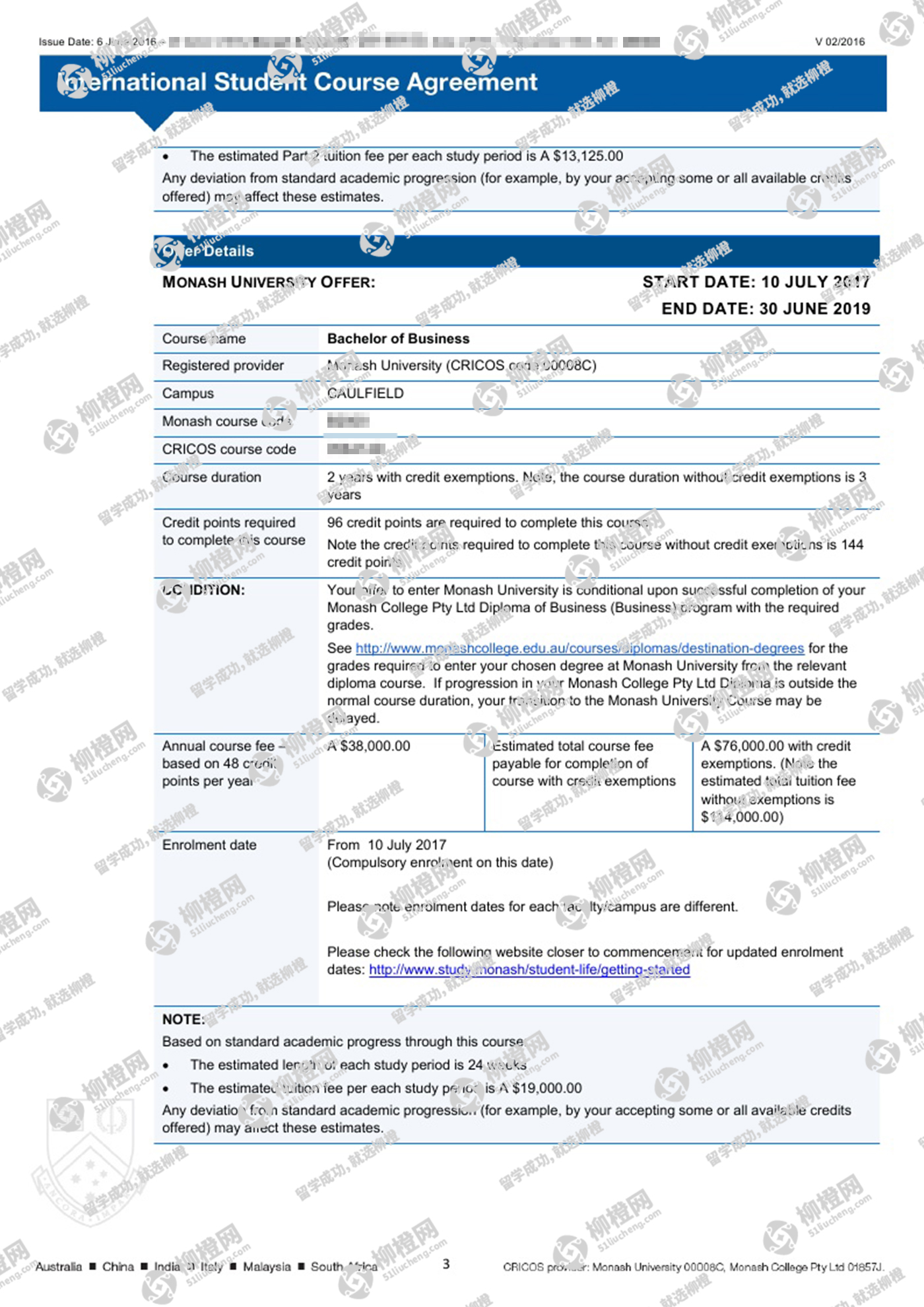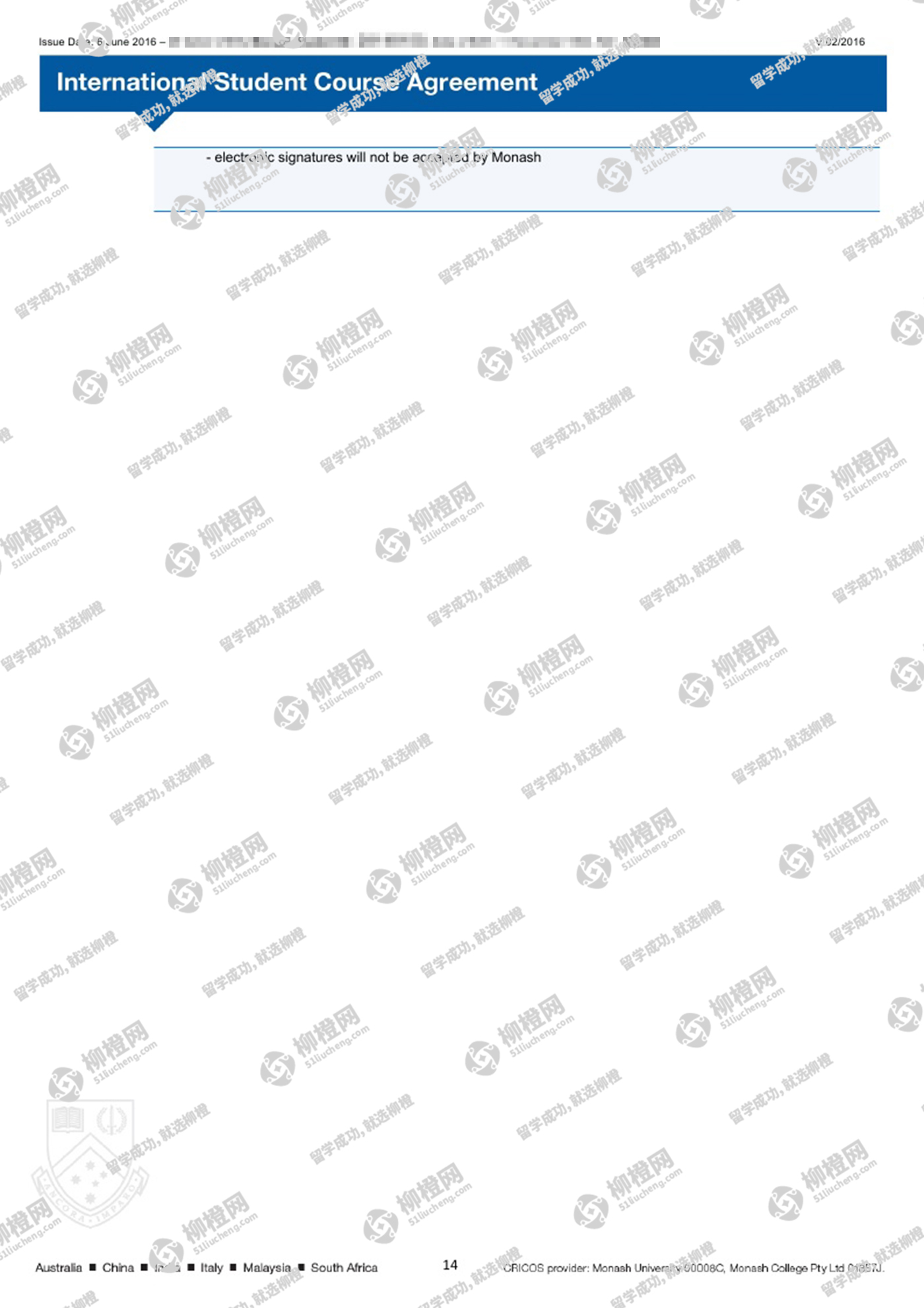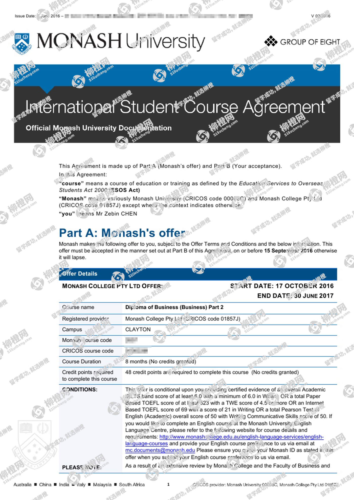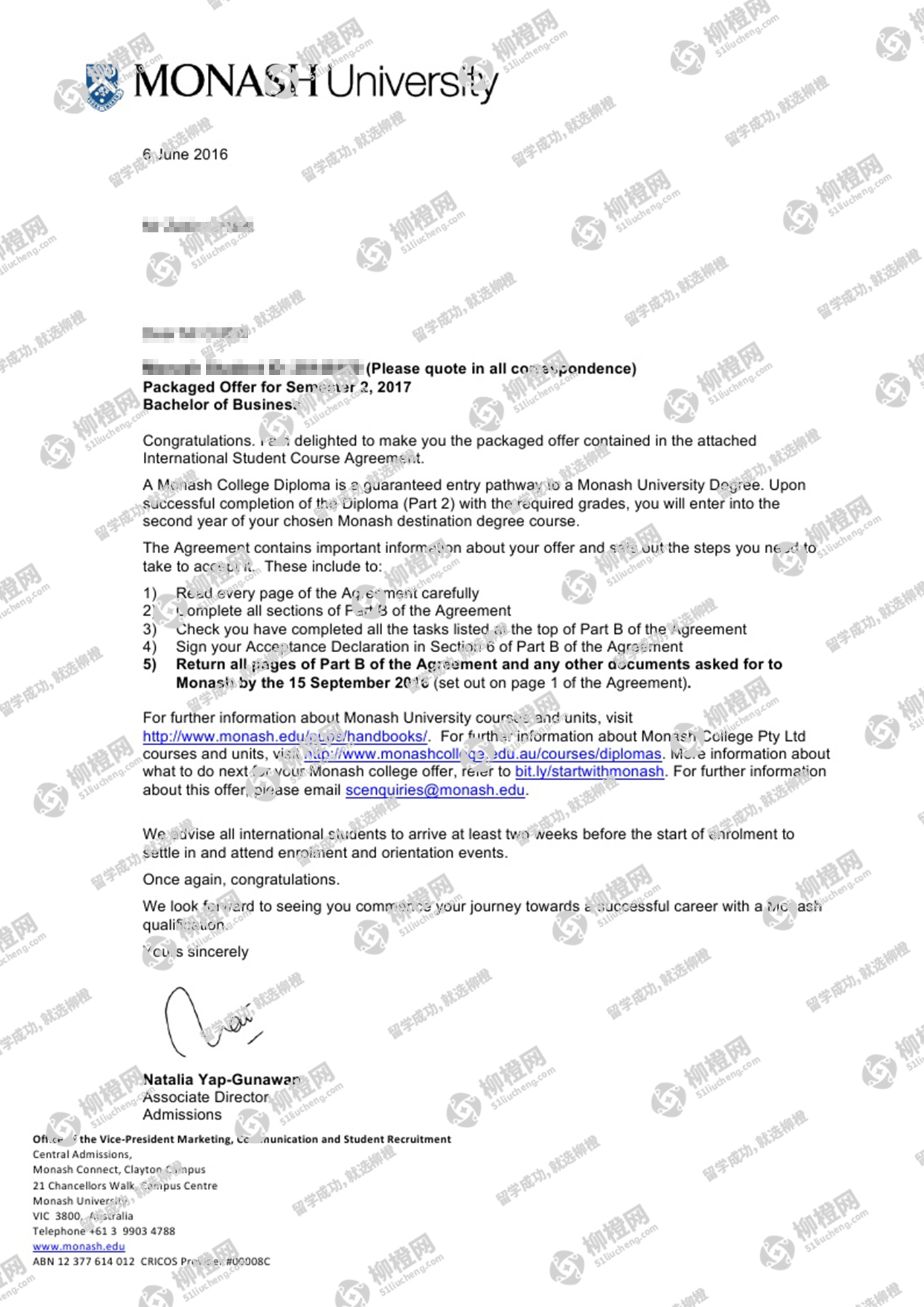 恭喜陈同学在柳橙网刘勇龙老师指导下顺利拿到莫纳什大学商业文凭课程offer