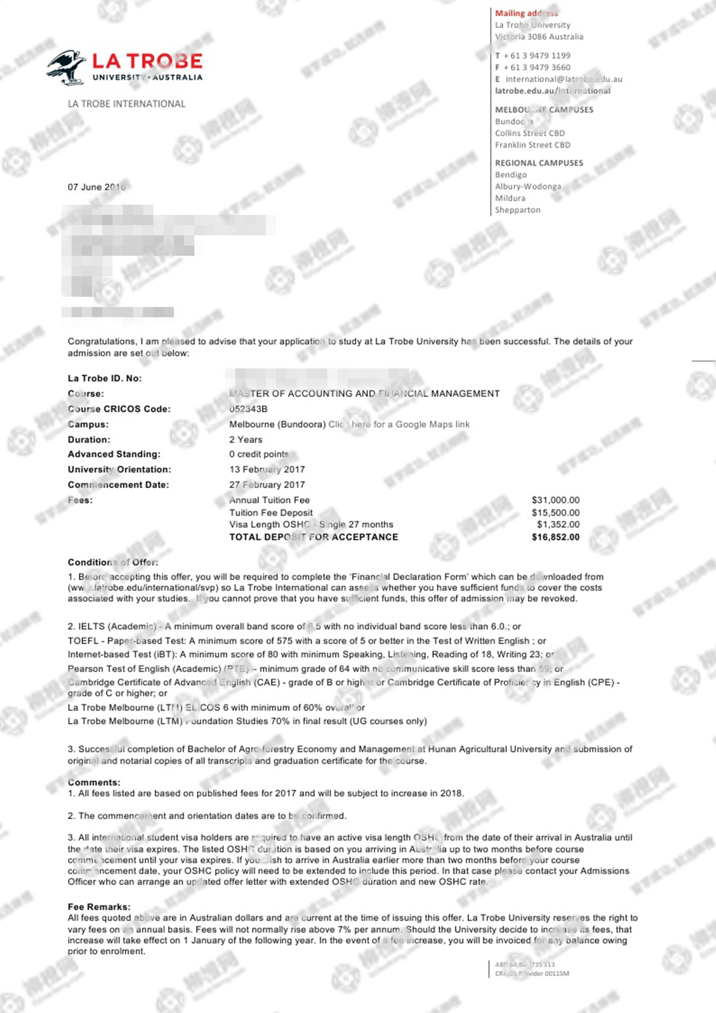 恭喜郑同学在柳橙网刘勇龙老师指导下顺利拿到澳洲拉伯筹大学会计与金融硕士offer