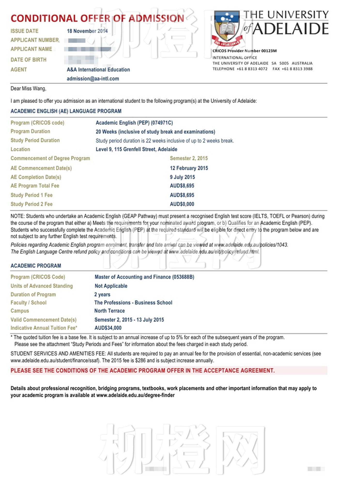 王同学上海政法学院国际法学专业,绩点3.2,在柳橙网成功跨专业申请到澳洲阿德莱德大学的会计金融专业