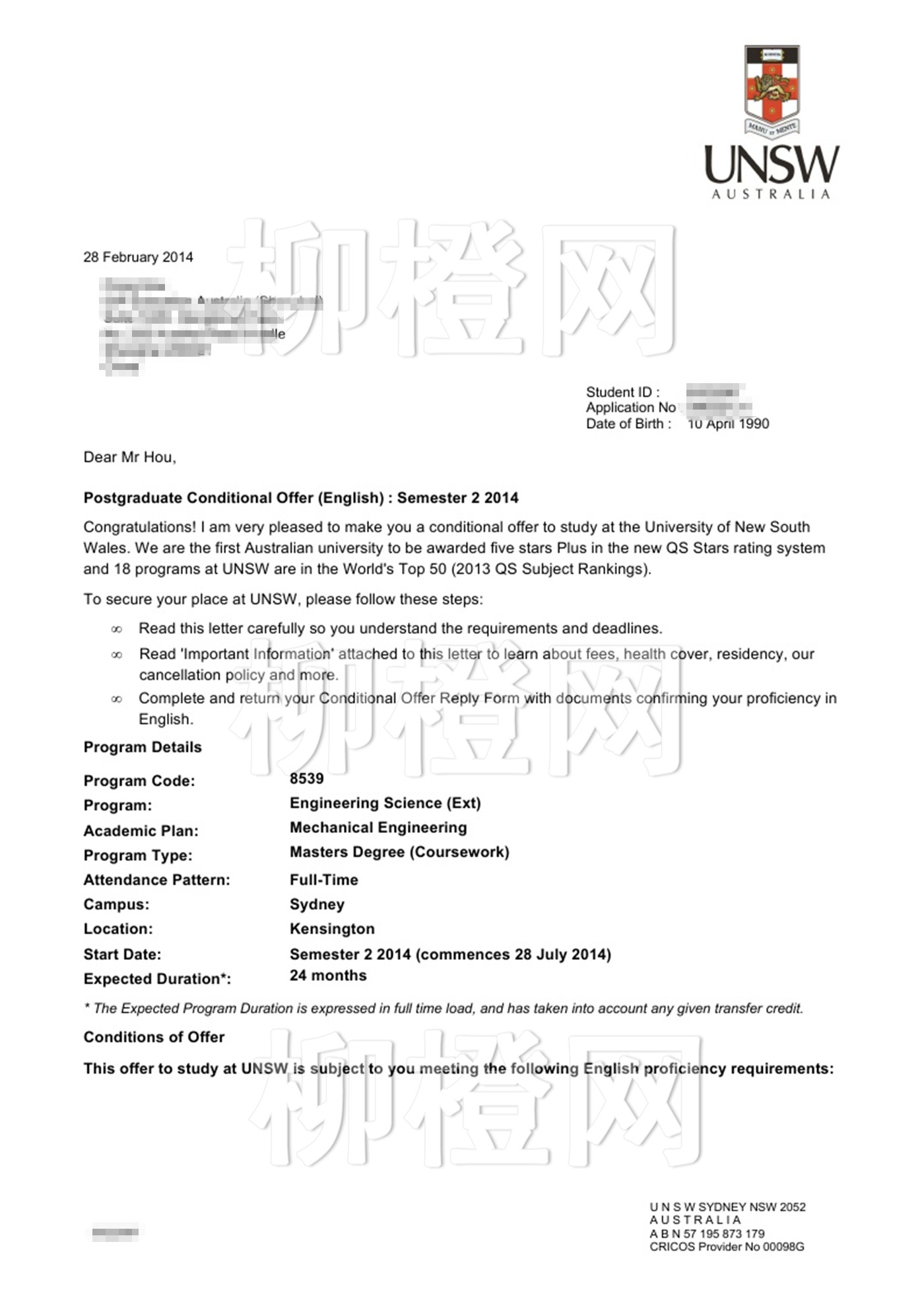 侯同学毕业于国内一所普通的本科院校,均分不到80,新南威尔士大学一直是他的梦想,恭喜侯同学梦想成真。