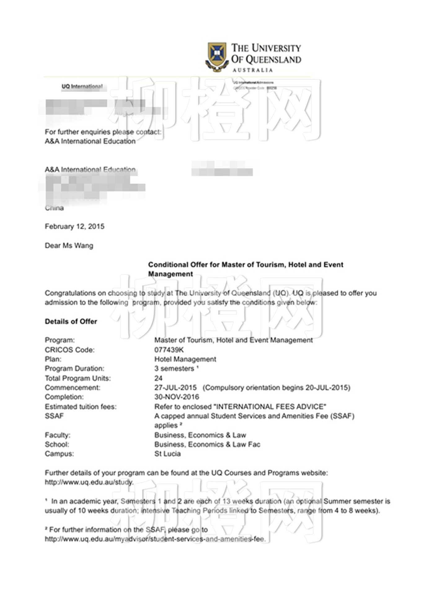 王同学 双非 酒店管理专业 均分83 在柳橙网的规划和安排下成功申请到了昆士兰大学的旅游酒店管理专业