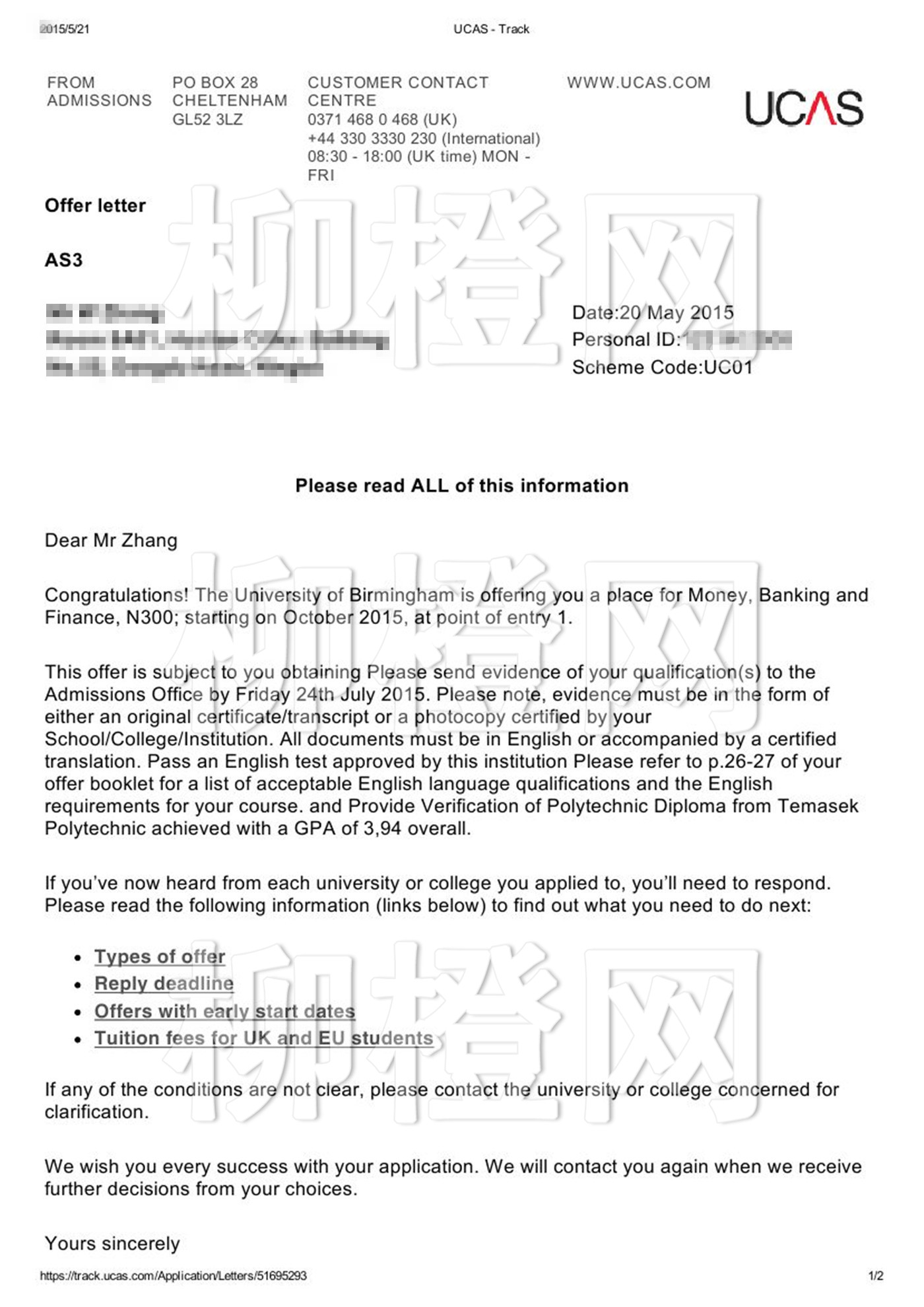 新加坡淡马锡理工学院,绩点3.94,在柳橙网老师的专业指导下成功申请到了英国伯明翰大学