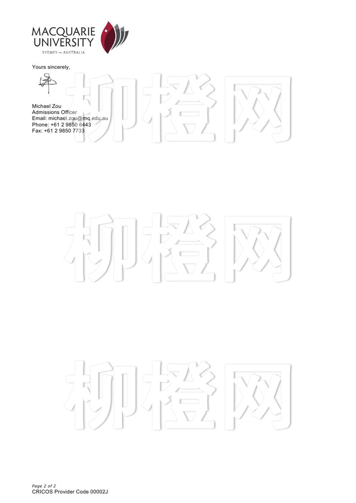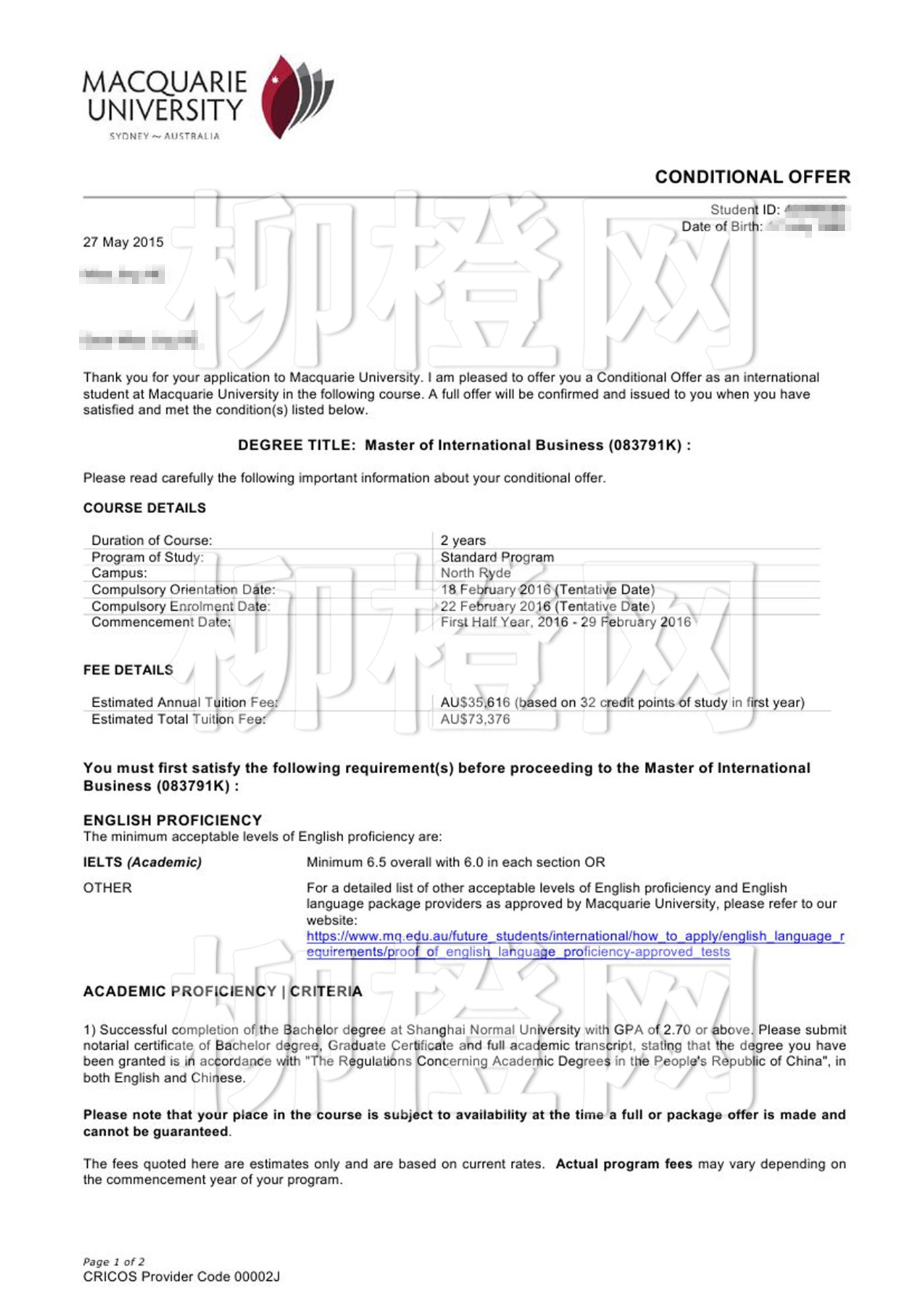 上师大的贺同学,工程转商科申请,在柳橙网的帮助下拿到麦考瑞的录取,很满意,好评