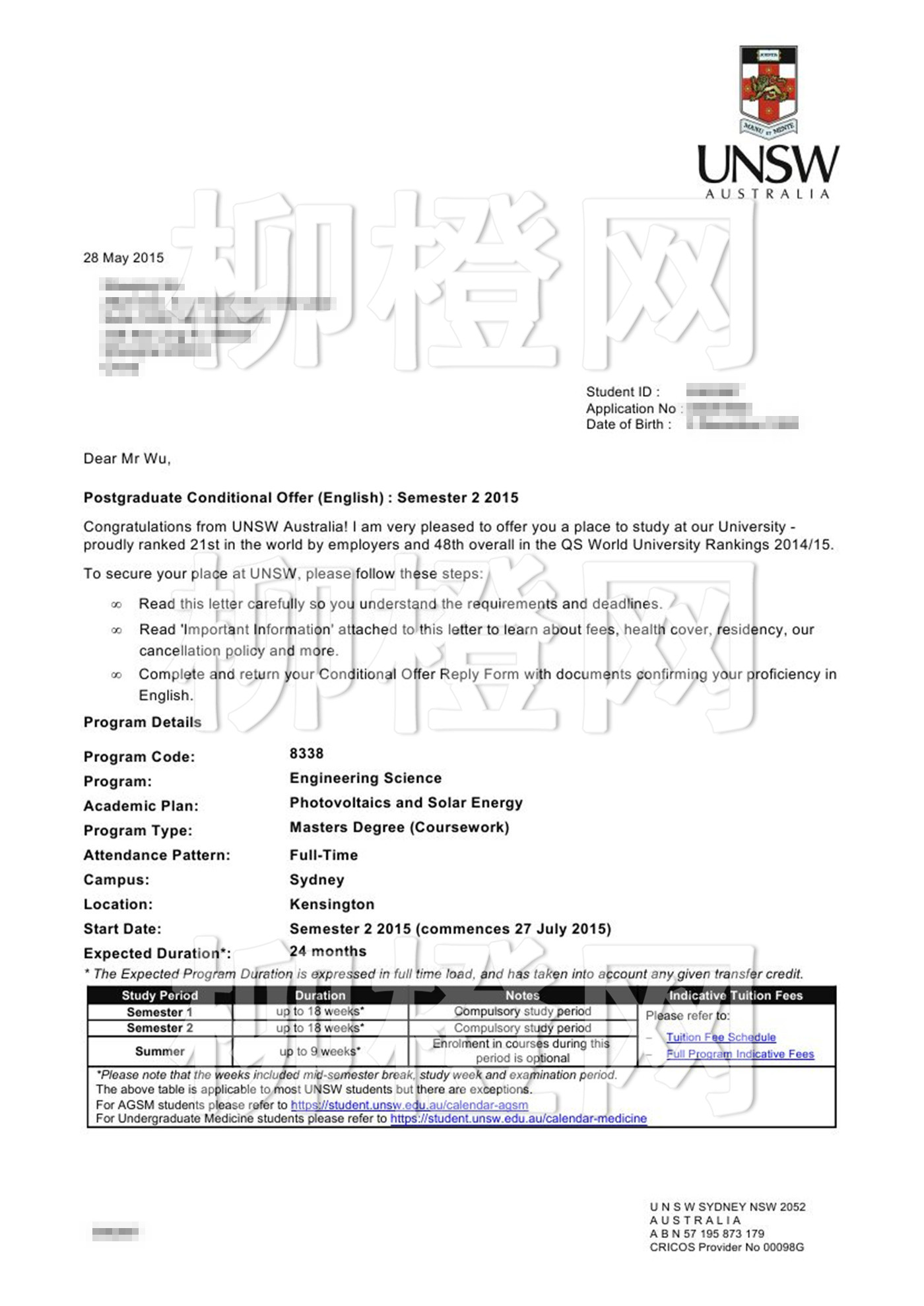 南昌大学,均分76,在柳橙网老师的专业指导下成功申请到了澳洲新南威尔士大学