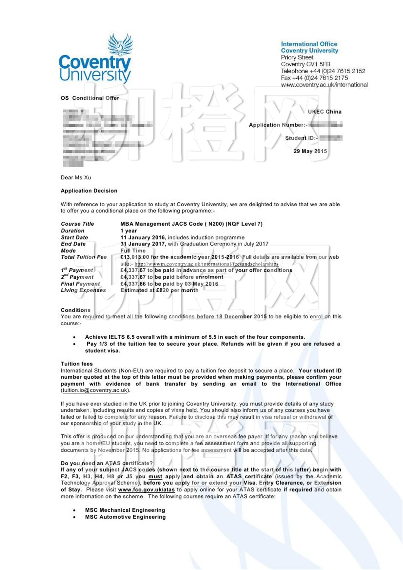 上海第二工业大学,均分70,在柳橙网老师的专业指导下成功的申请到了纽卡斯尔大学