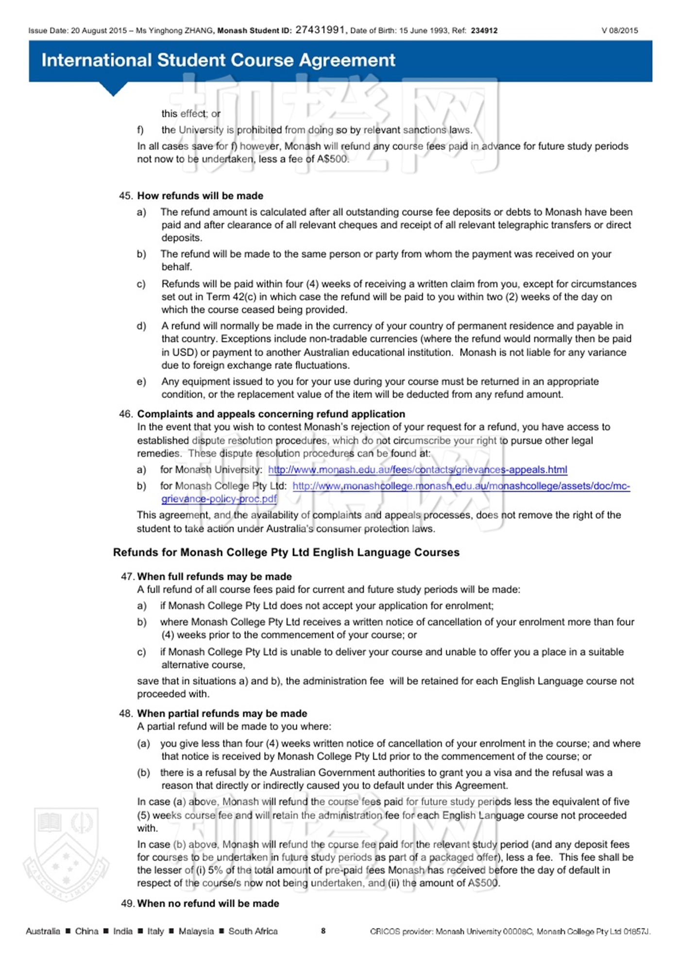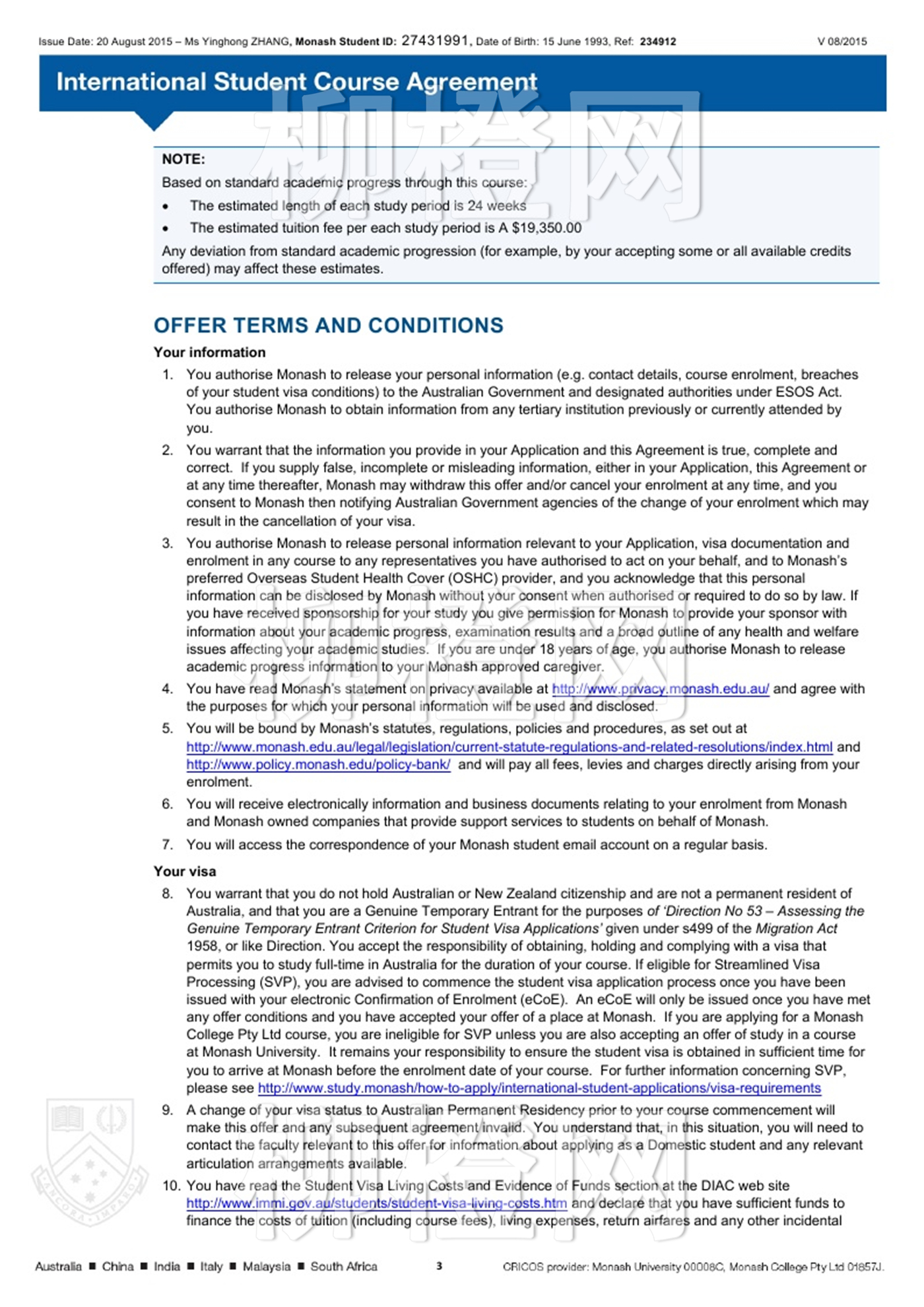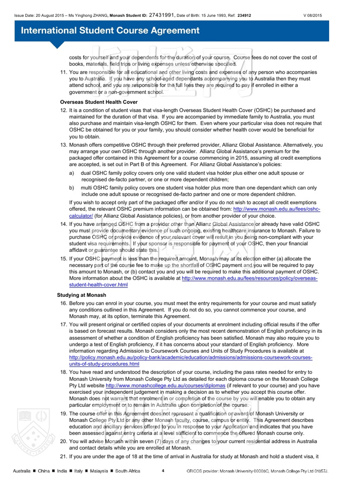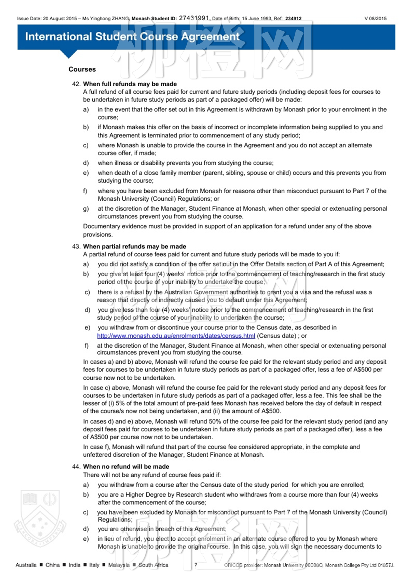 西安美术学院,均分82,在柳橙网老师的专业指导下申请到了澳洲八大之一的莫纳什大学学习商科