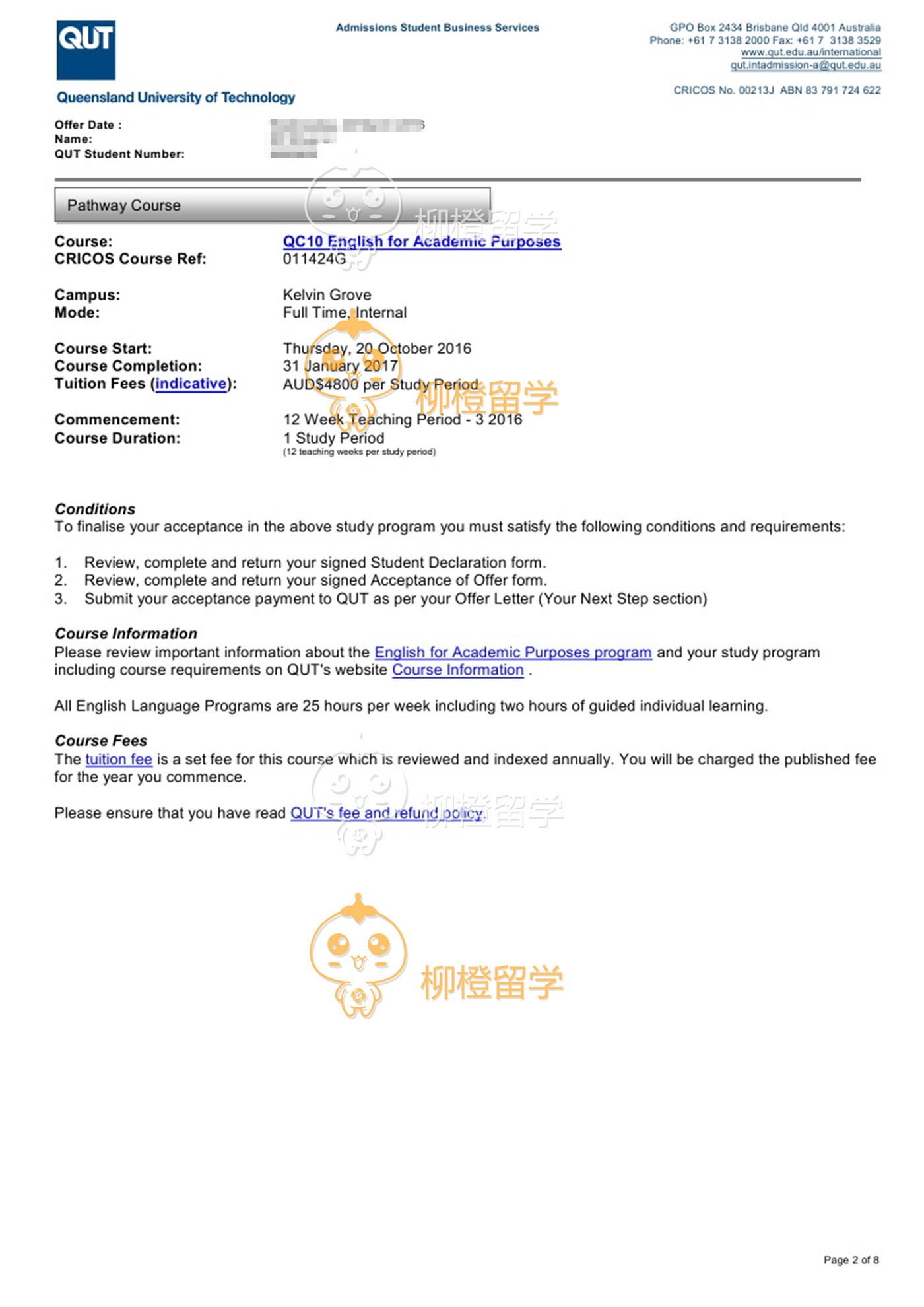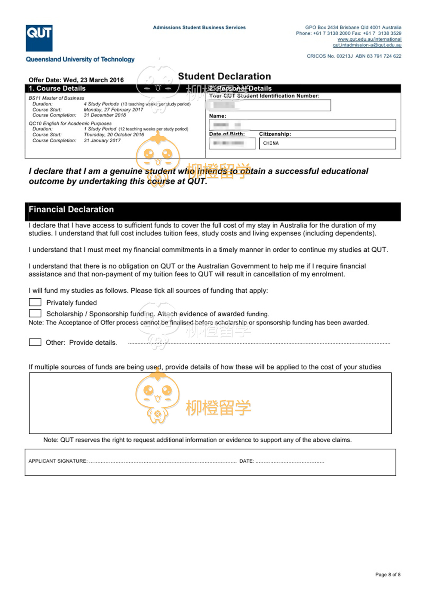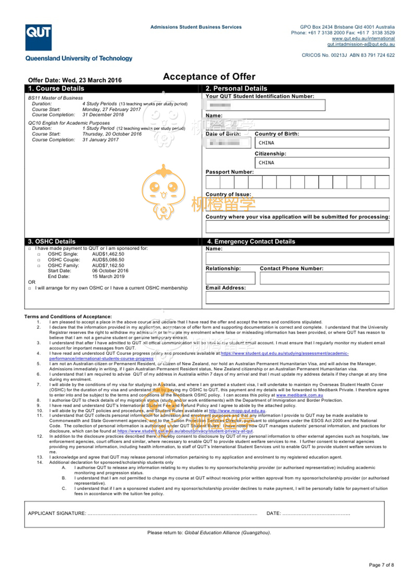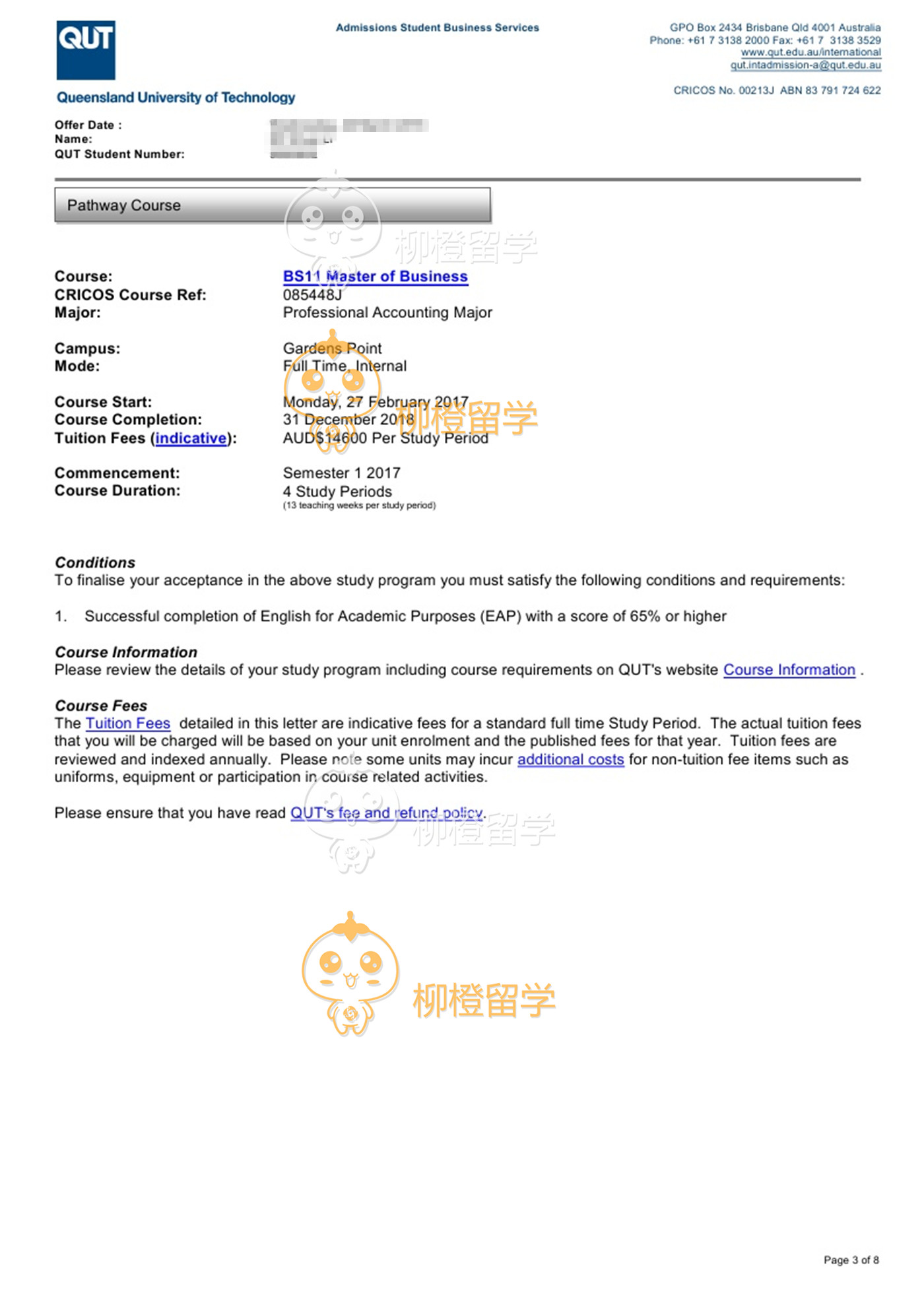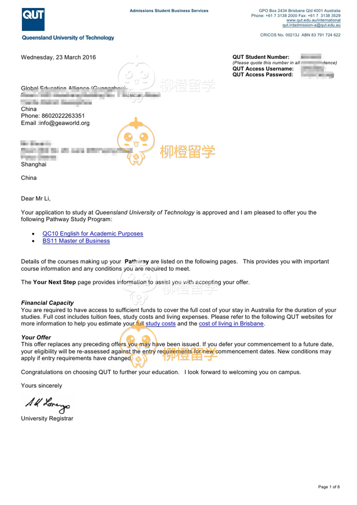 李同学上海应用技术学院应用化学专业,均分78.18,在柳橙网成功申请到澳洲昆士兰科技大学会计专业