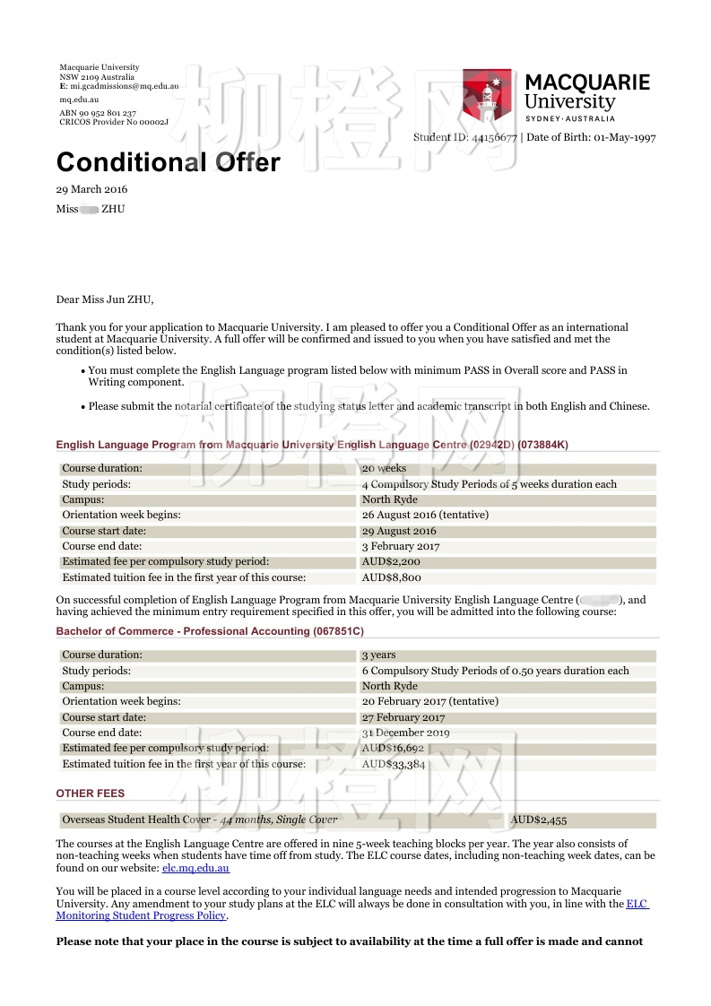 朱同学 双非 大专 86分 在柳橙网的帮助和规划下成功申请到了麦考瑞大学的会计专业