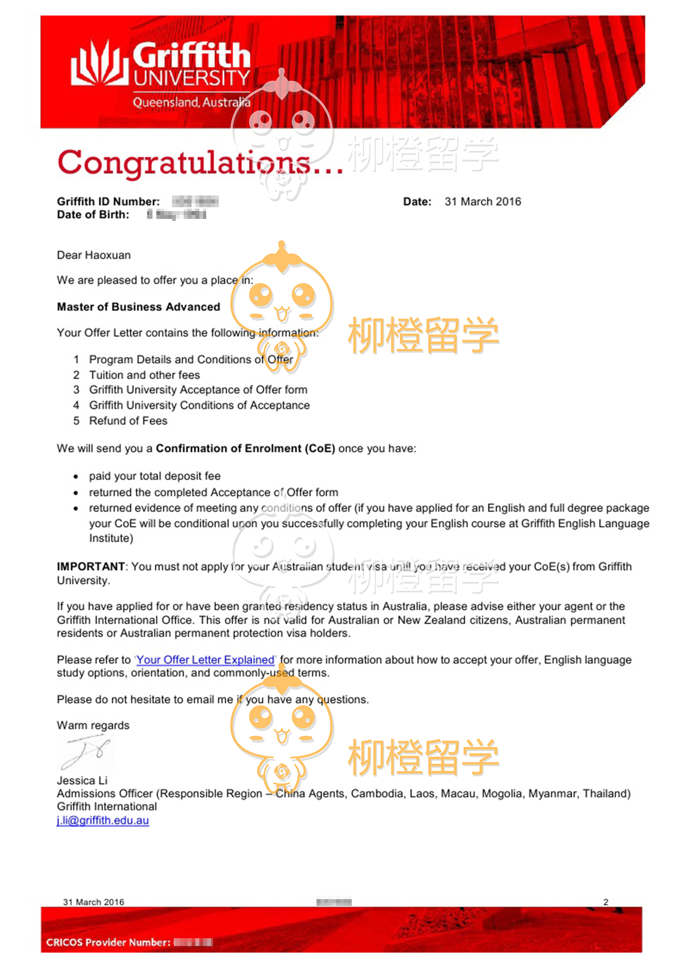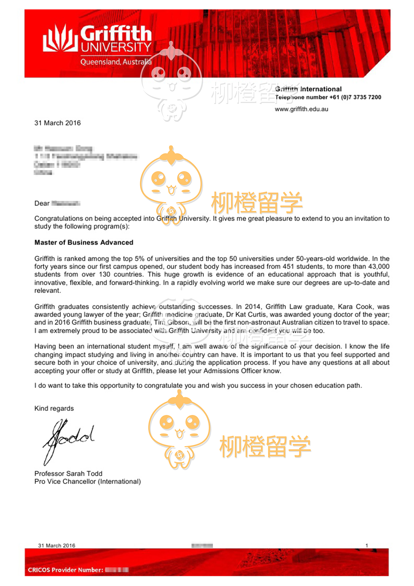 董同学天津工业大学复合材料科学与工程,均分72,在柳橙网成功申请到澳洲格里菲斯大学Master of Business(International Tourism and Hospitality Management)Advanced
