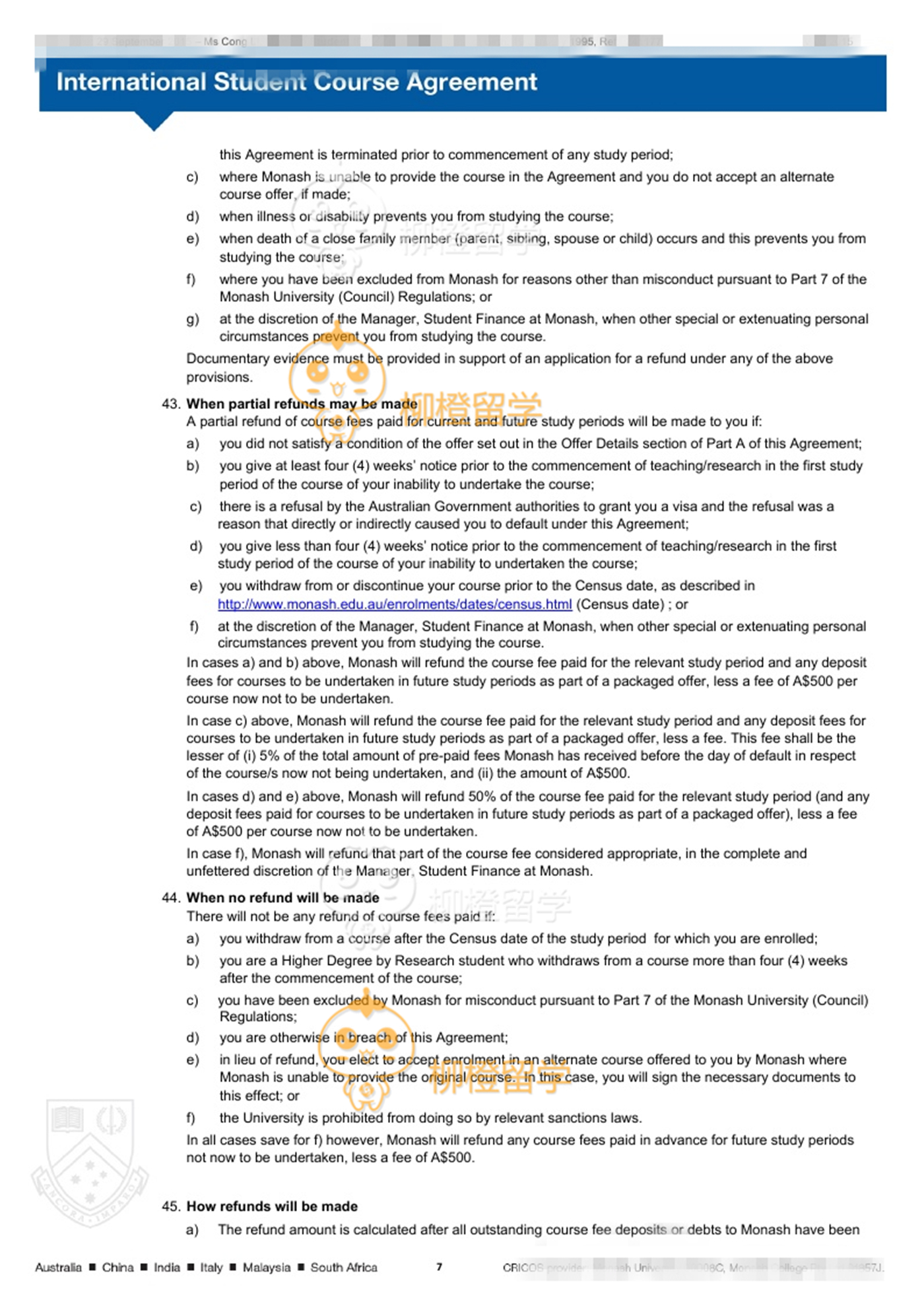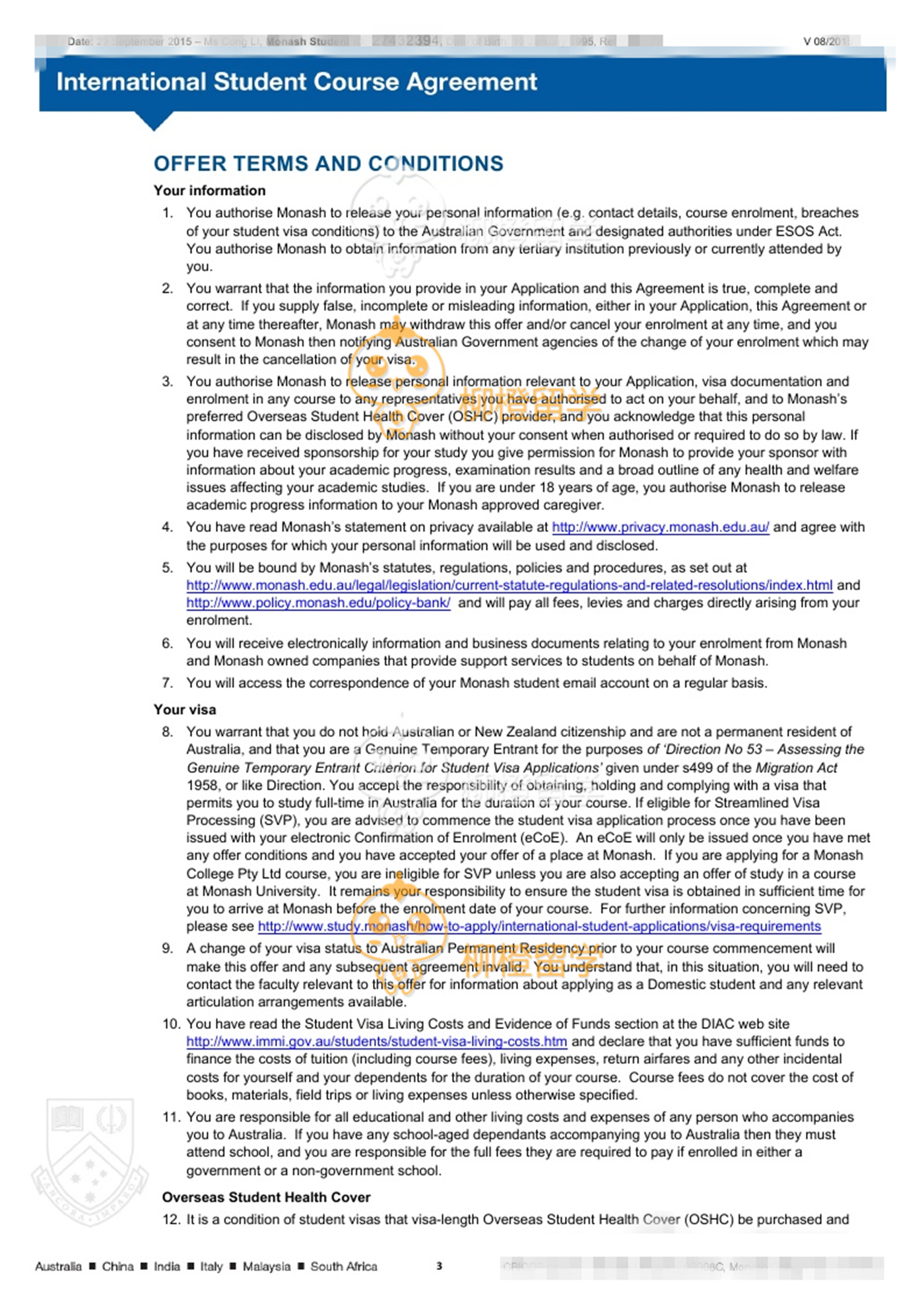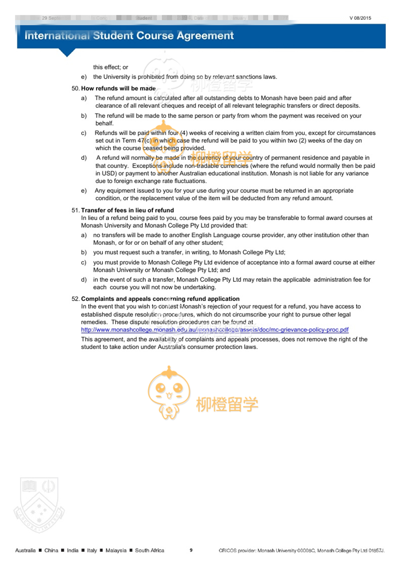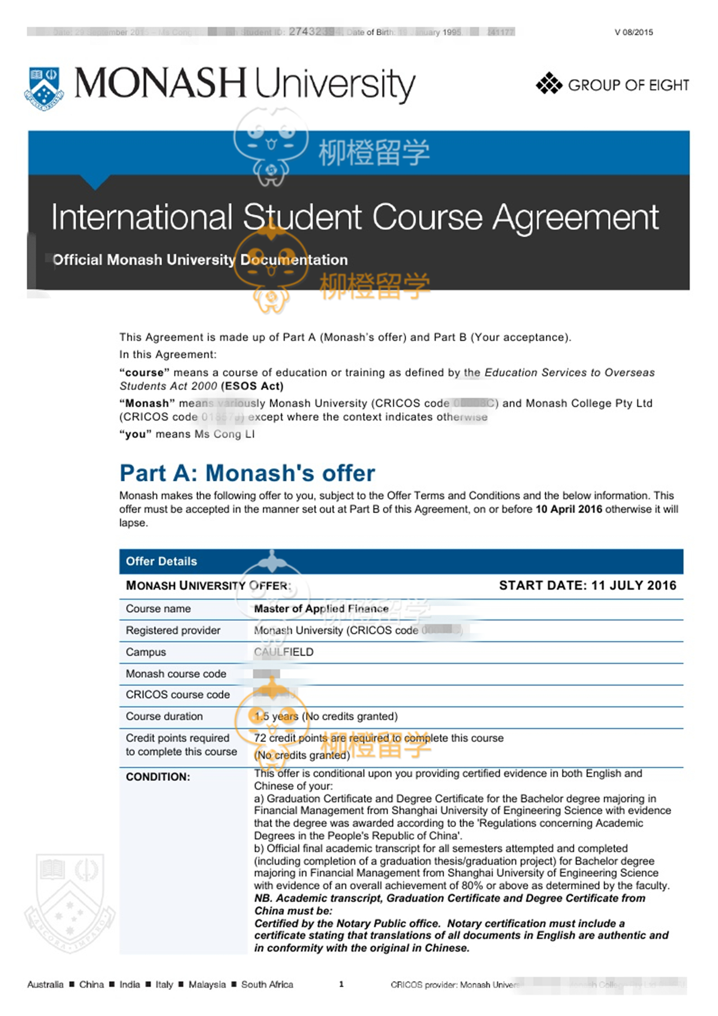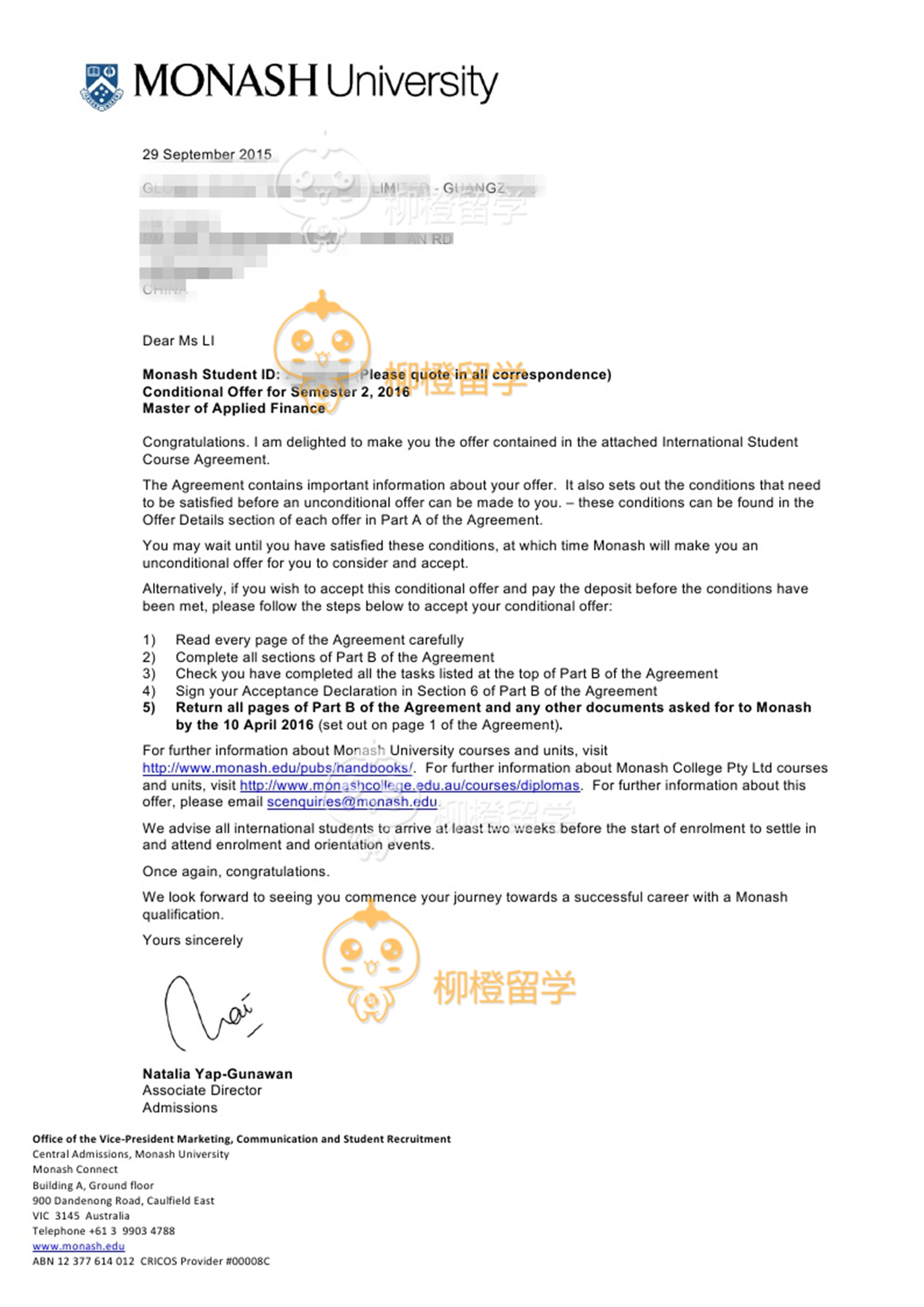 李同学上海工程技术大学均分90财务管理专业在柳橙网的帮助下成功申请到了Monash University的Master of Applied Finance