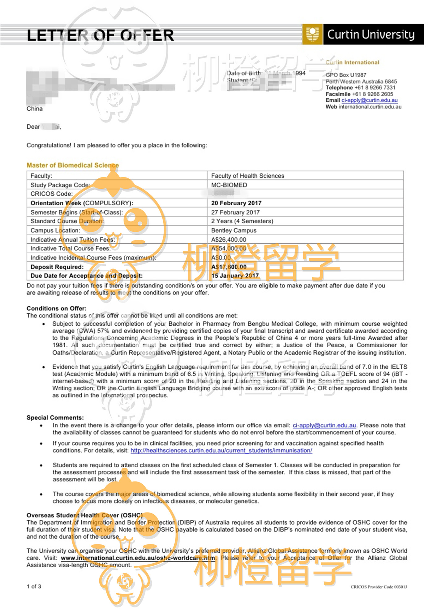 蚌埠医学院,临床医学,绩点3.14,申到科廷大学Biomedical Science硕士