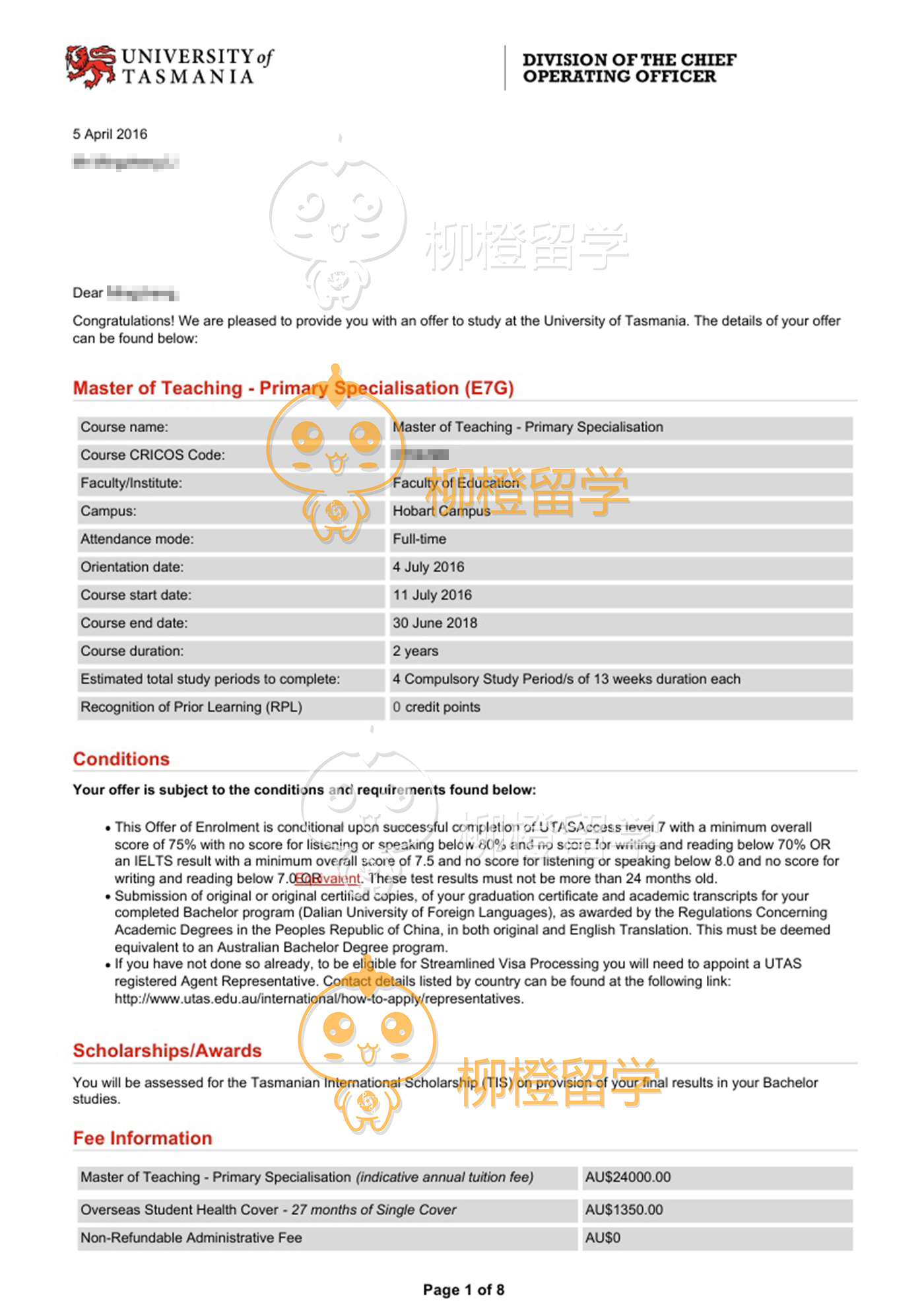 学生国内本科成绩优异,想申请澳洲比较难申请的教育专业并且有移民打算,在柳橙网老师合理的规划之下,顺利拿到塔大的teaching offer