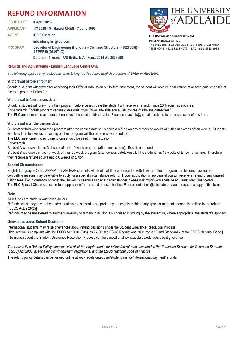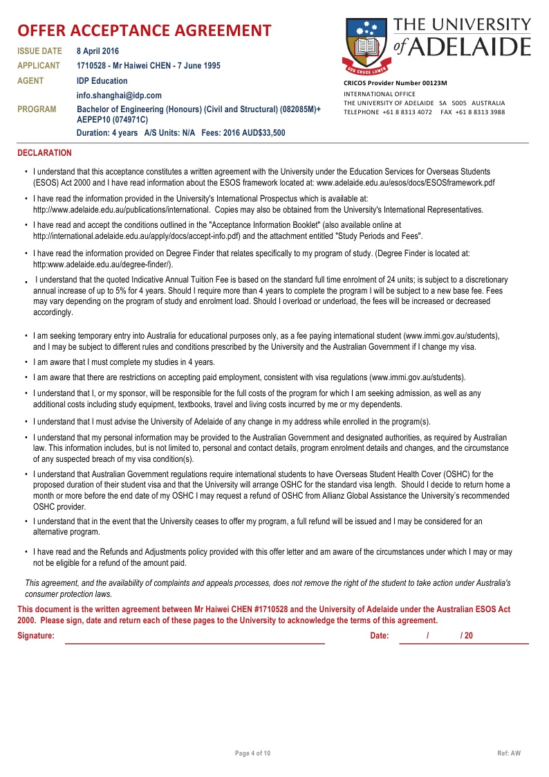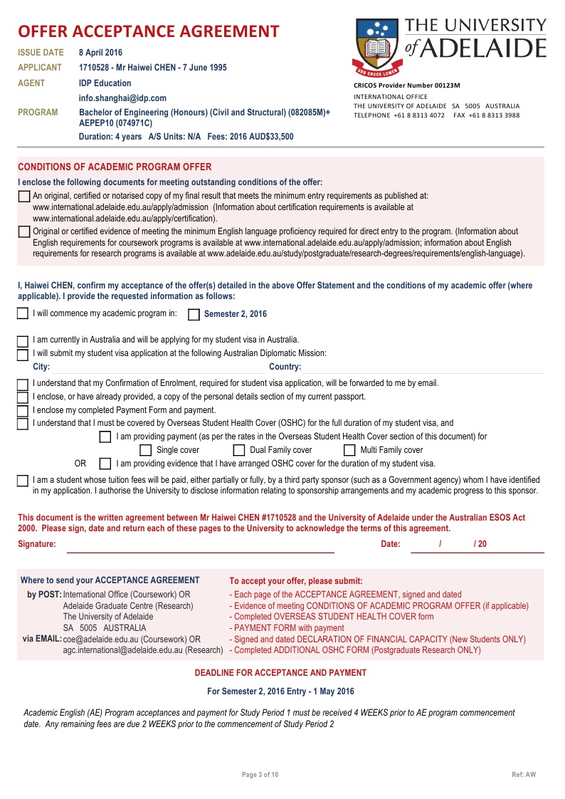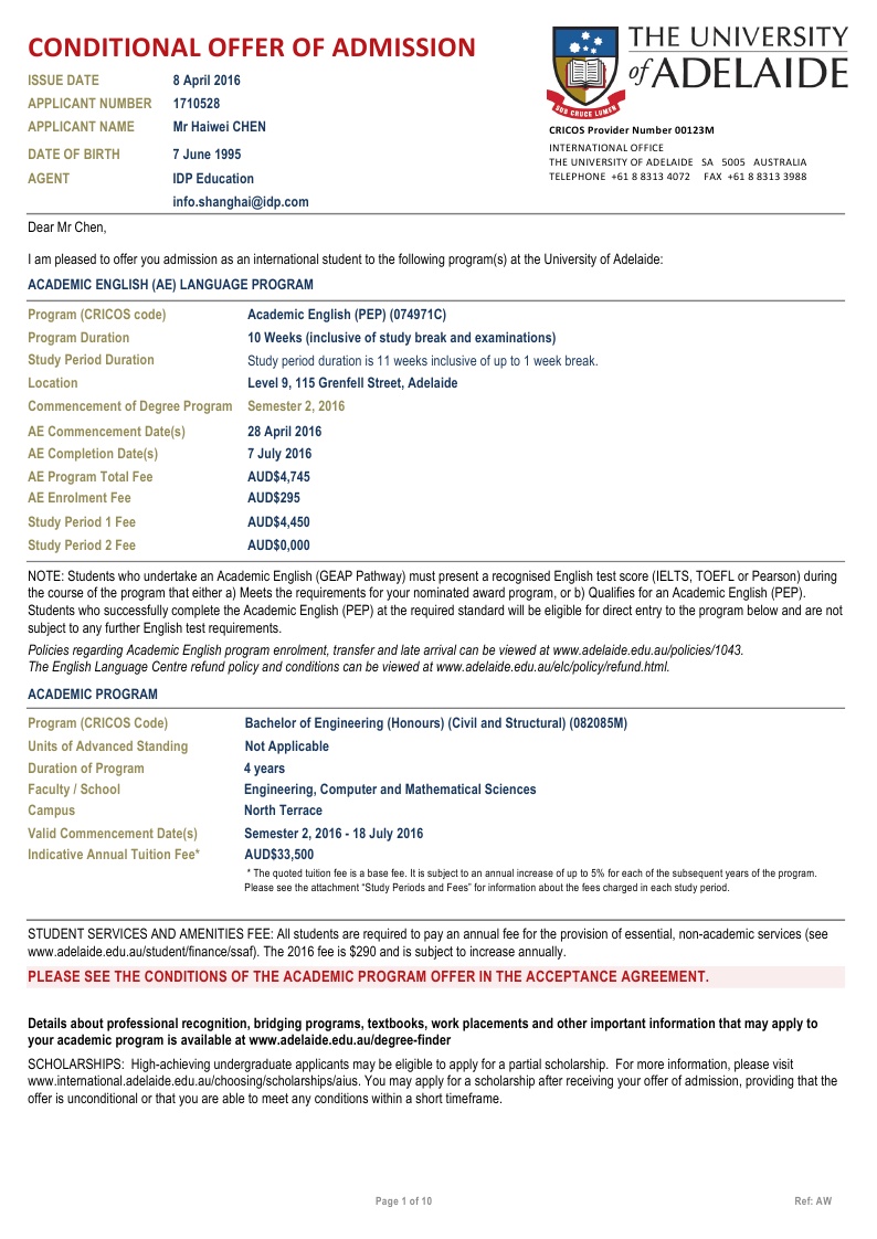 该同学在新加坡博伟教育学院读的Alevel课程,在我们柳橙网一个月以内就拿到了澳大利亚阿德莱德大学的有条件录取。阿德莱德是澳洲八大之一,位于南澳州,环境相对的优美,也是唯一一个有地区移民加分的八大。