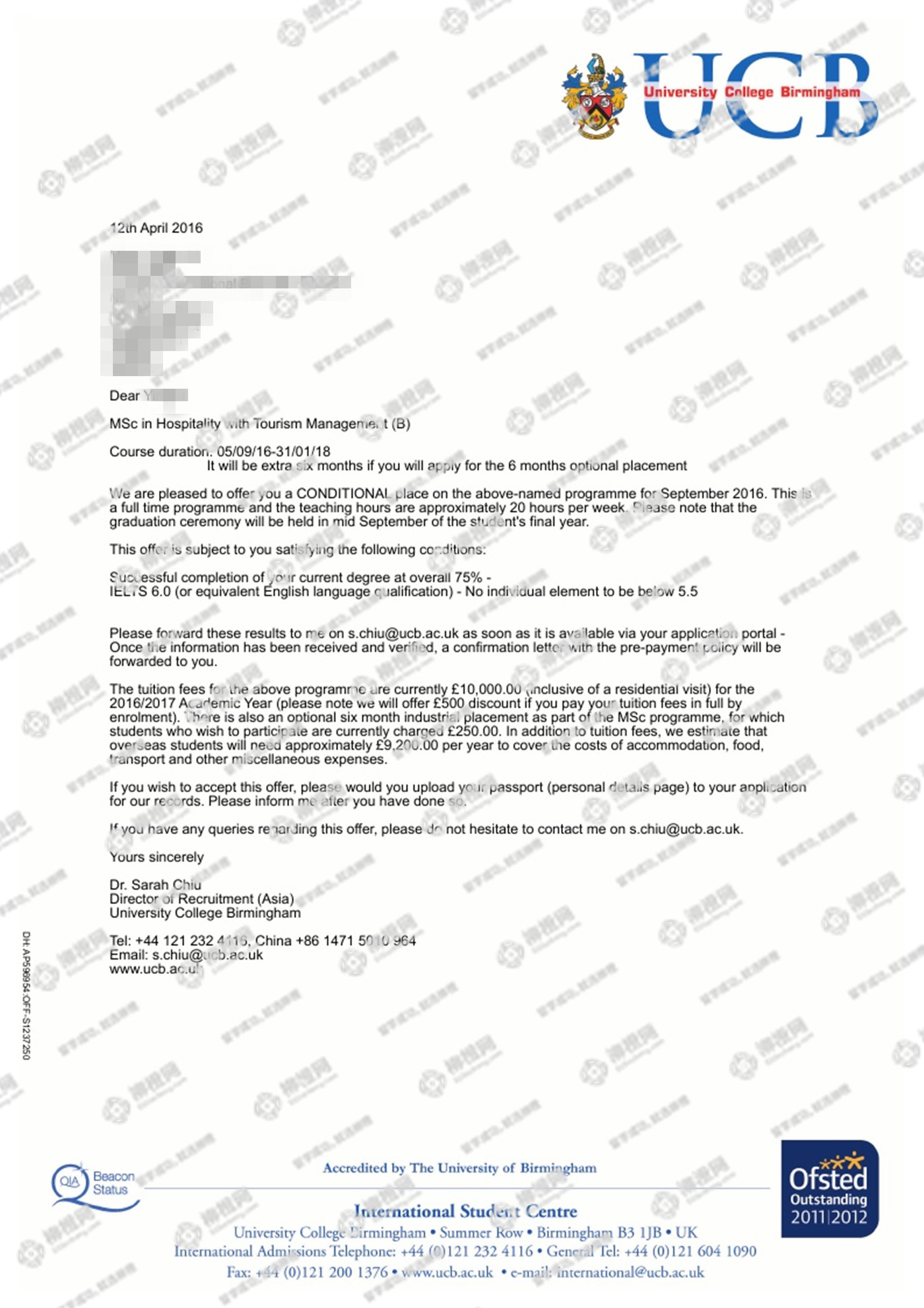 李同学是个很开朗的学生,通过柳橙网,成功拿到英国伯明翰大学学院offer
