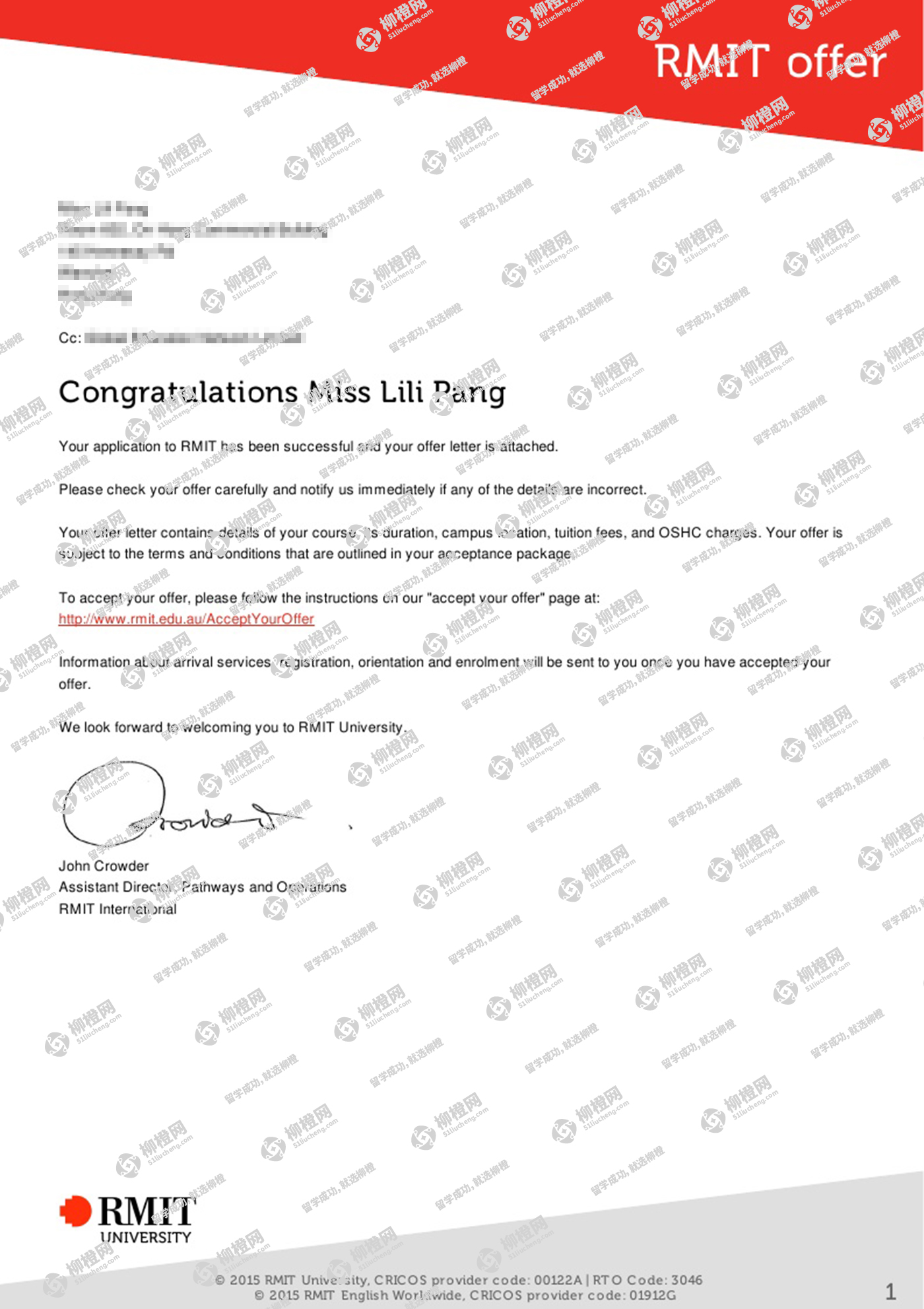恭喜庞同学通过柳橙网获得墨尔本皇家理工大学offer!