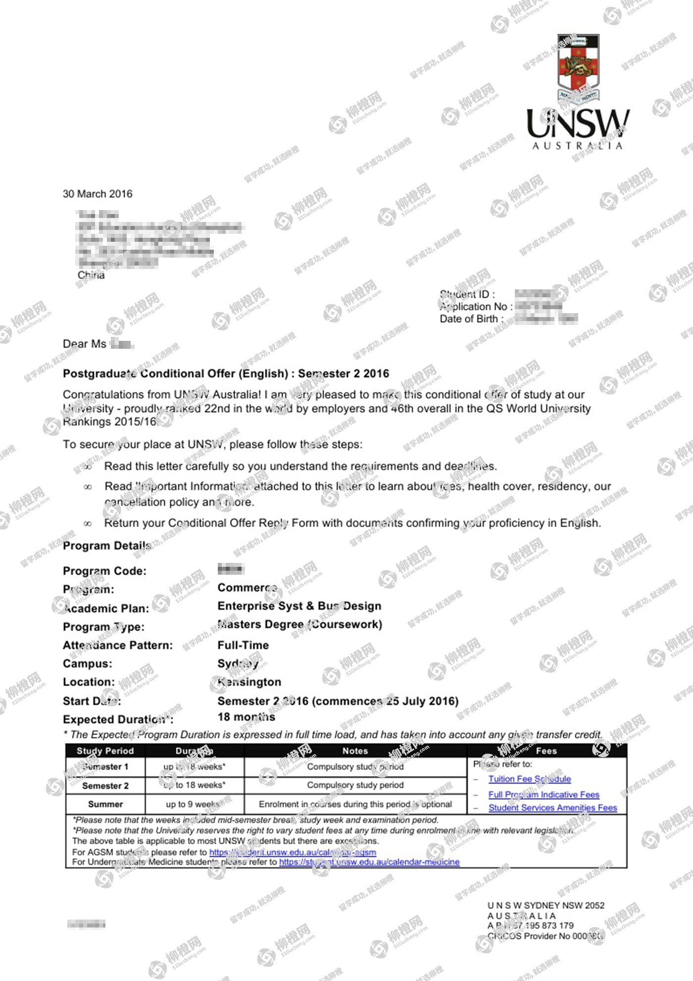 曹同学背景就很好,通过柳橙网,一个月左右就拿到了UNSW的offer。很不错