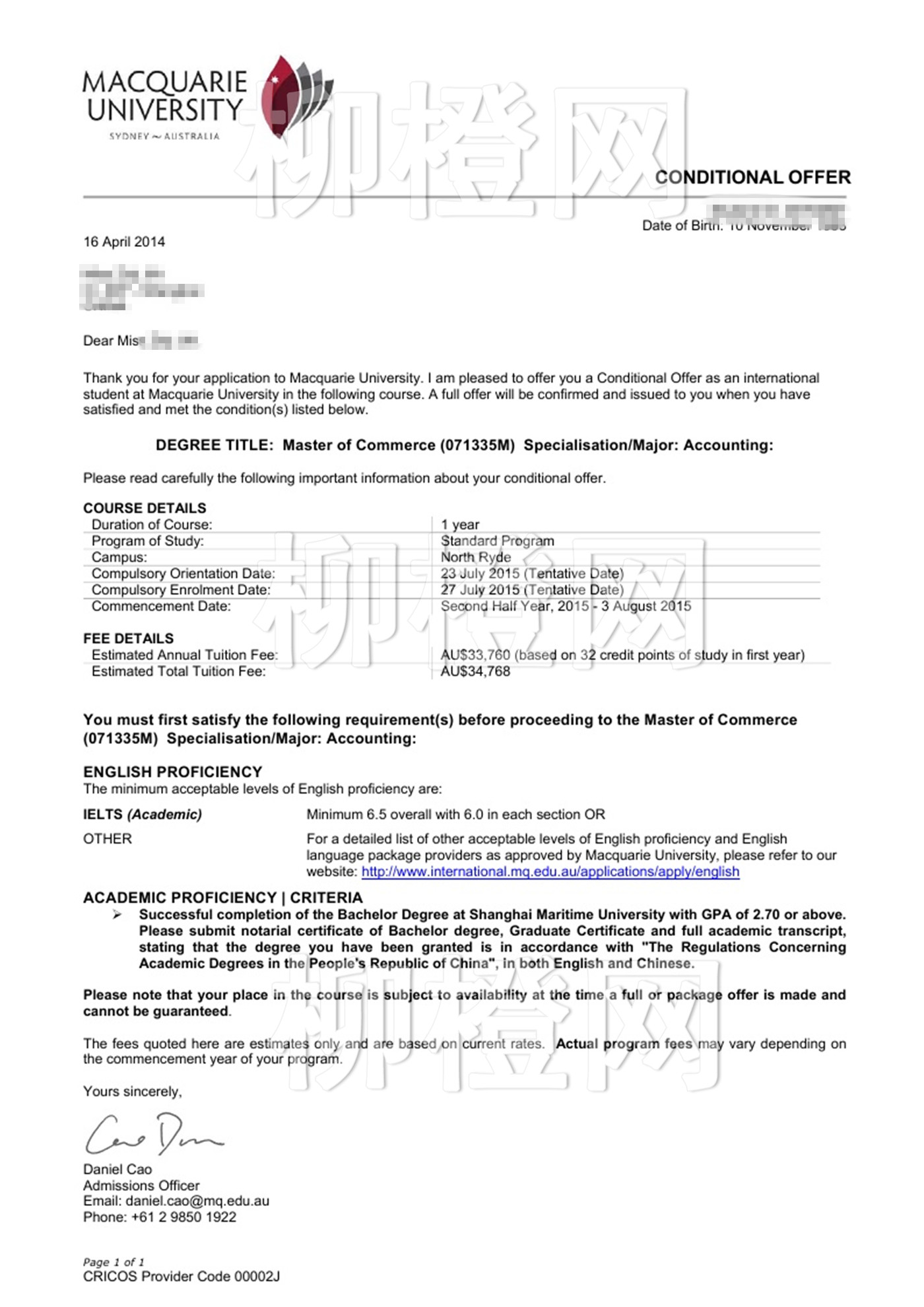 甲同学本科背景很一般,但成绩非常优秀,我在和甲同学沟通之后,选择了澳洲会计第一的麦考瑞大学,和墨尔本大学,悉尼大学。在大三的时候,就通过柳橙网用5个学期成绩单拿到了麦考瑞大学的offer,同时我还帮助甲同学拿到了世界五百强的财务实习。