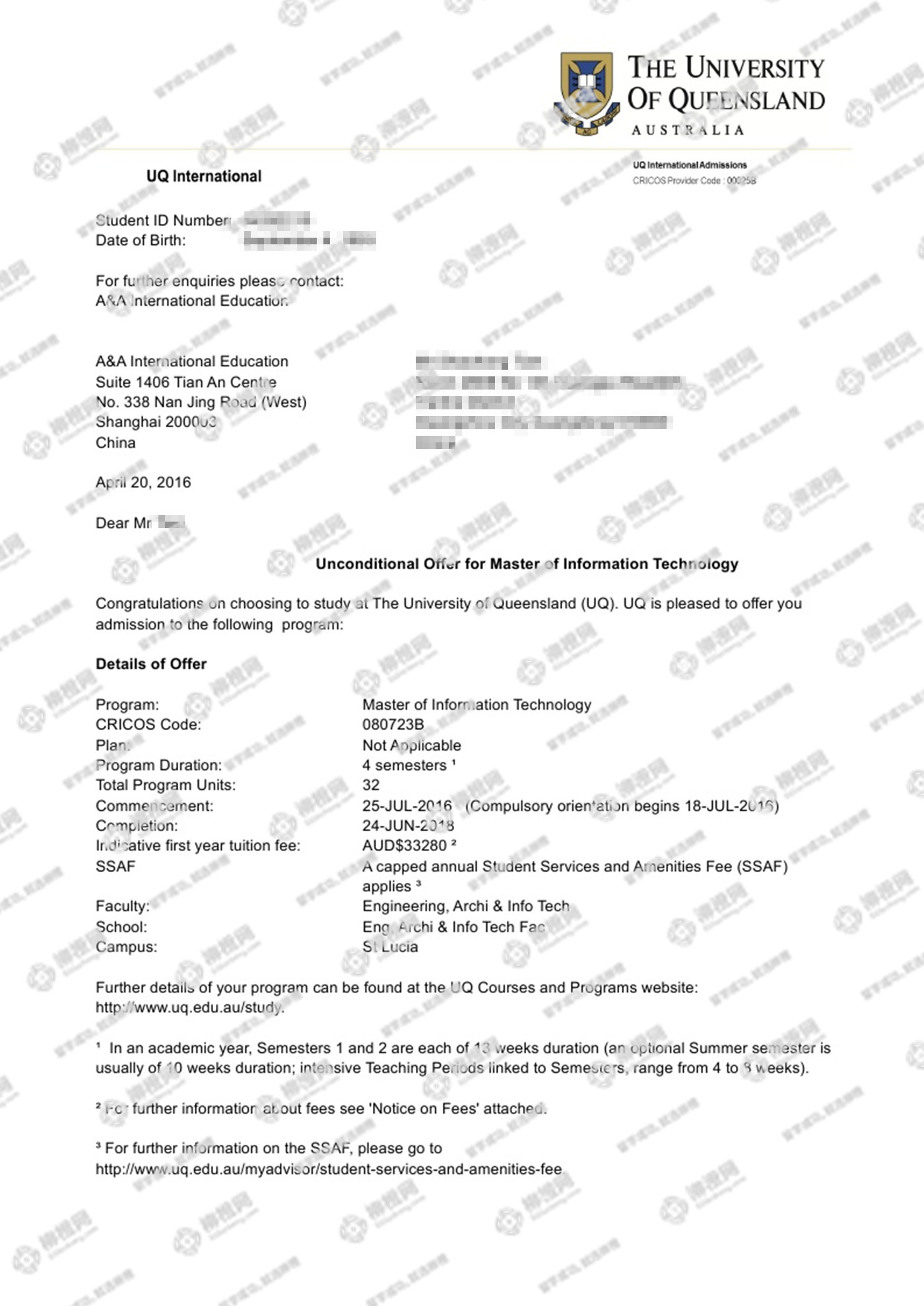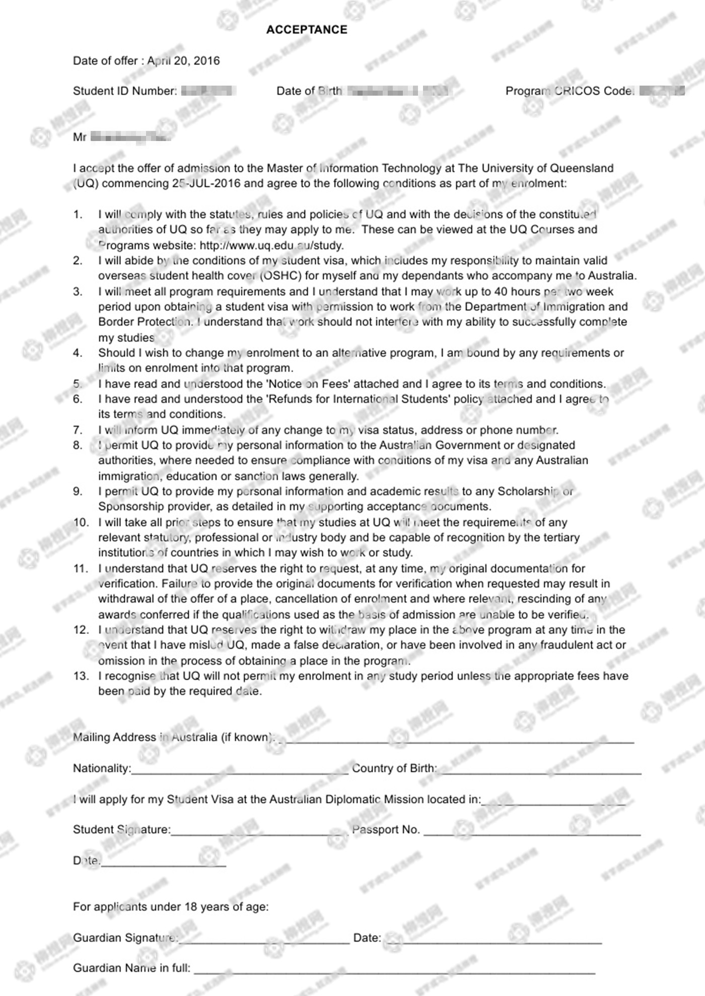 恭喜田同学通过柳橙网获得澳洲昆士兰大学offer!