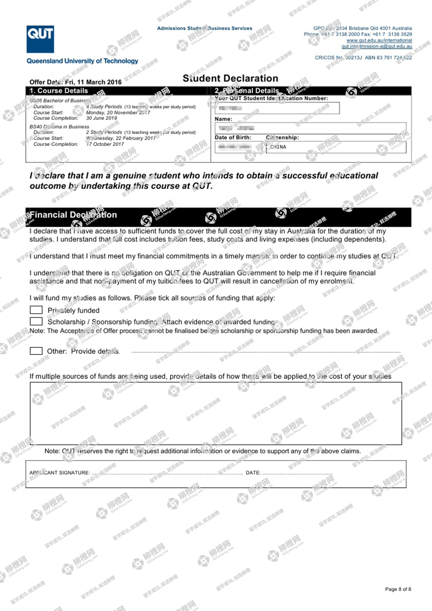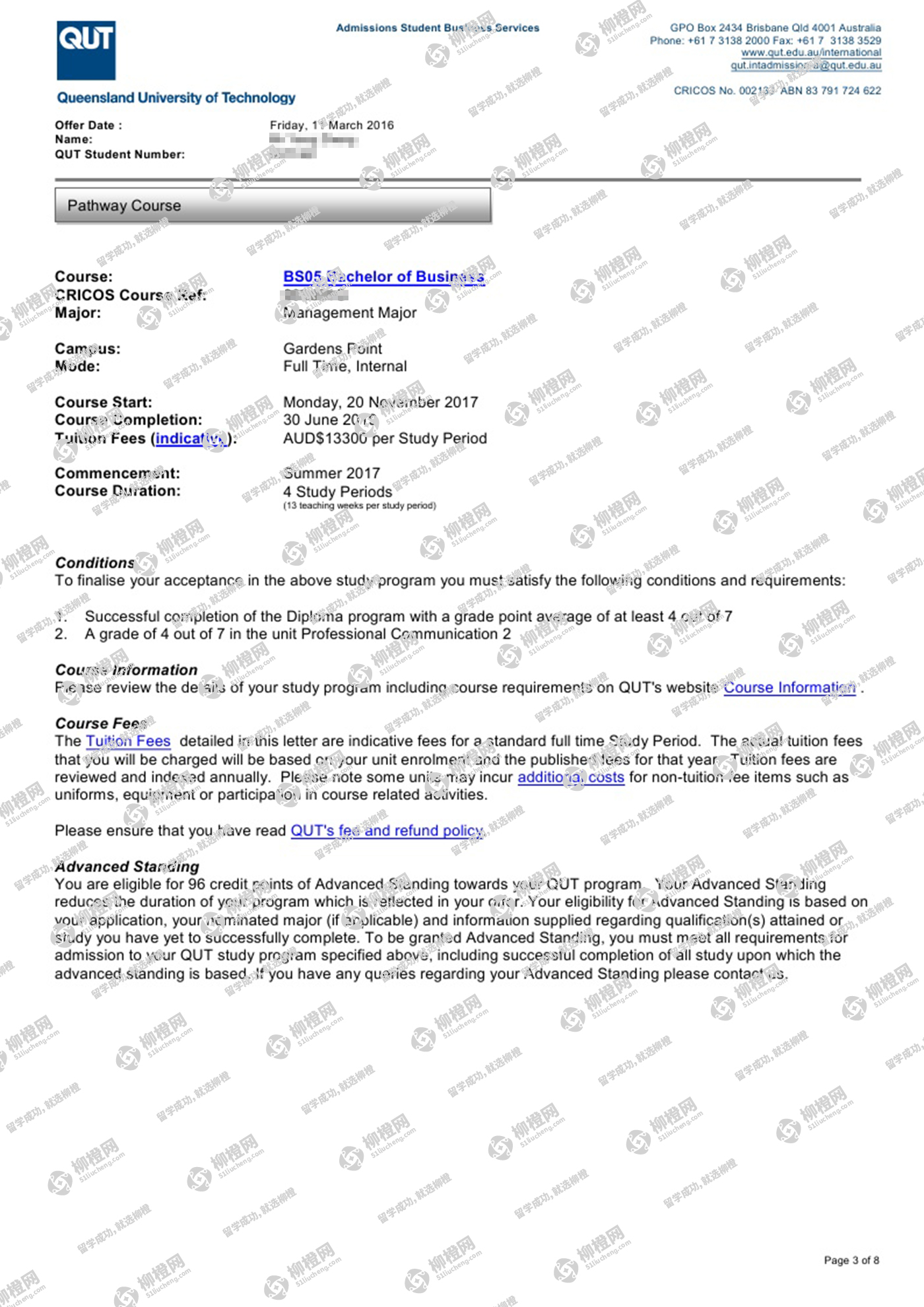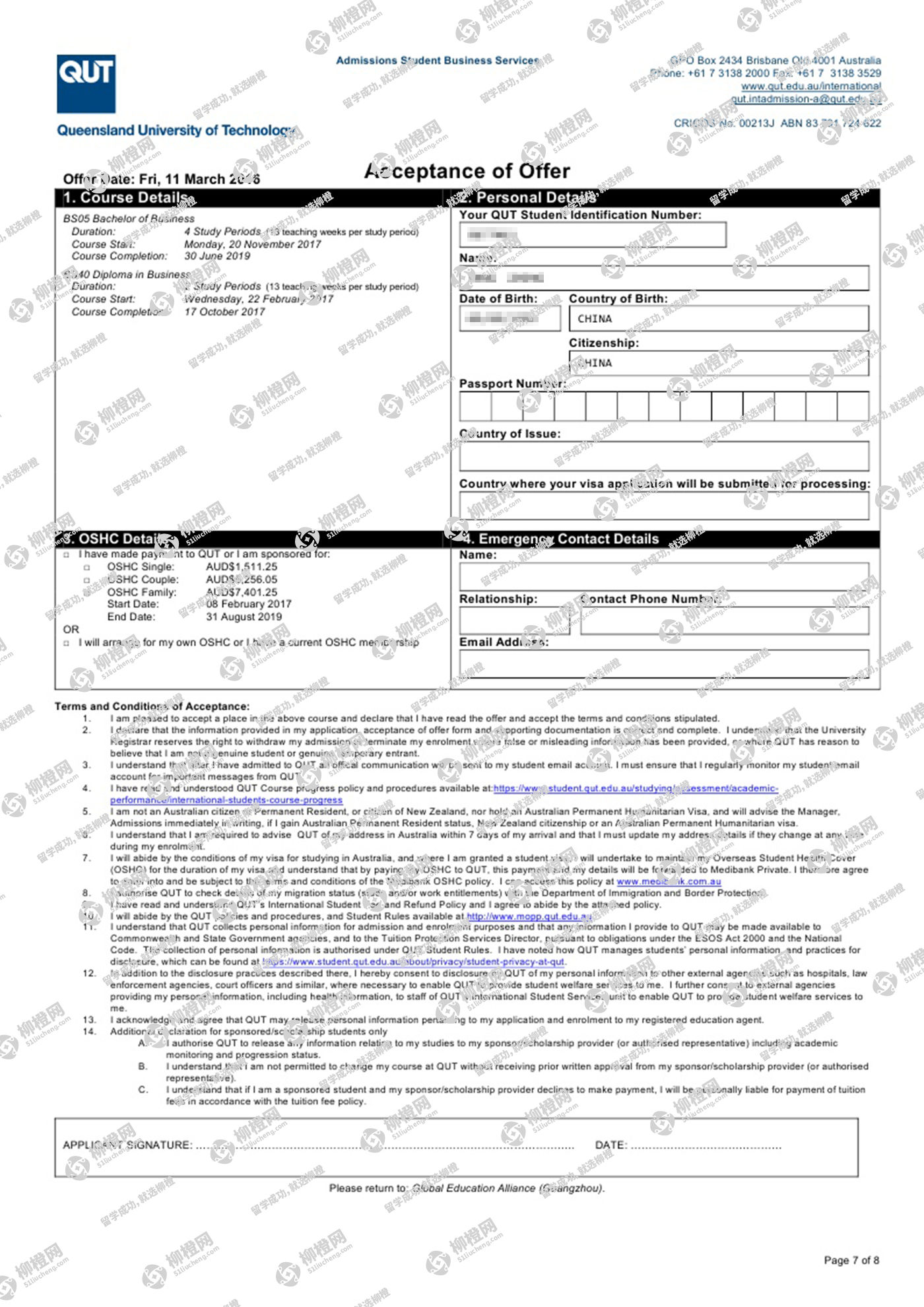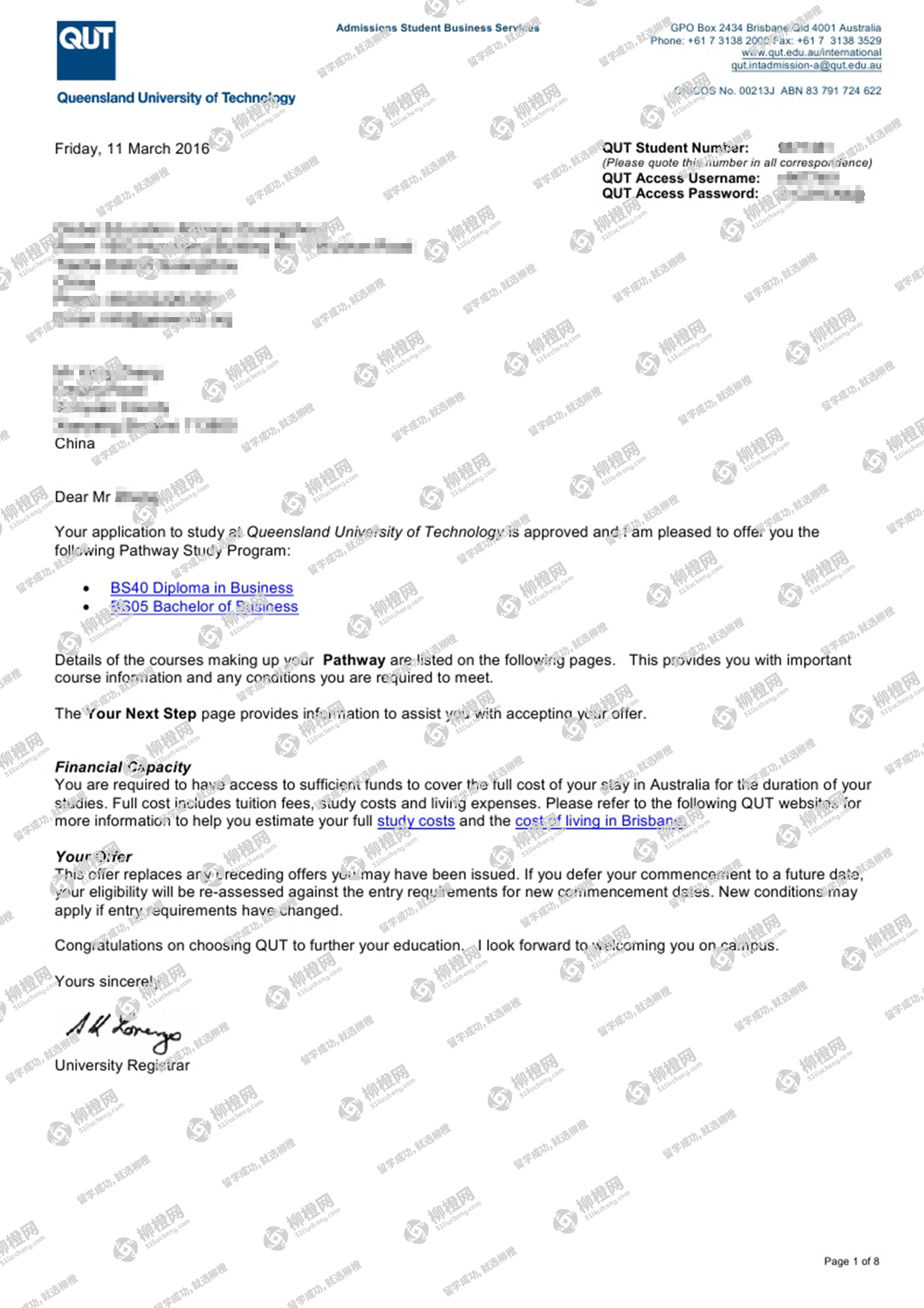 恭喜郑同学通过柳橙网获得昆士兰理工大学offer!