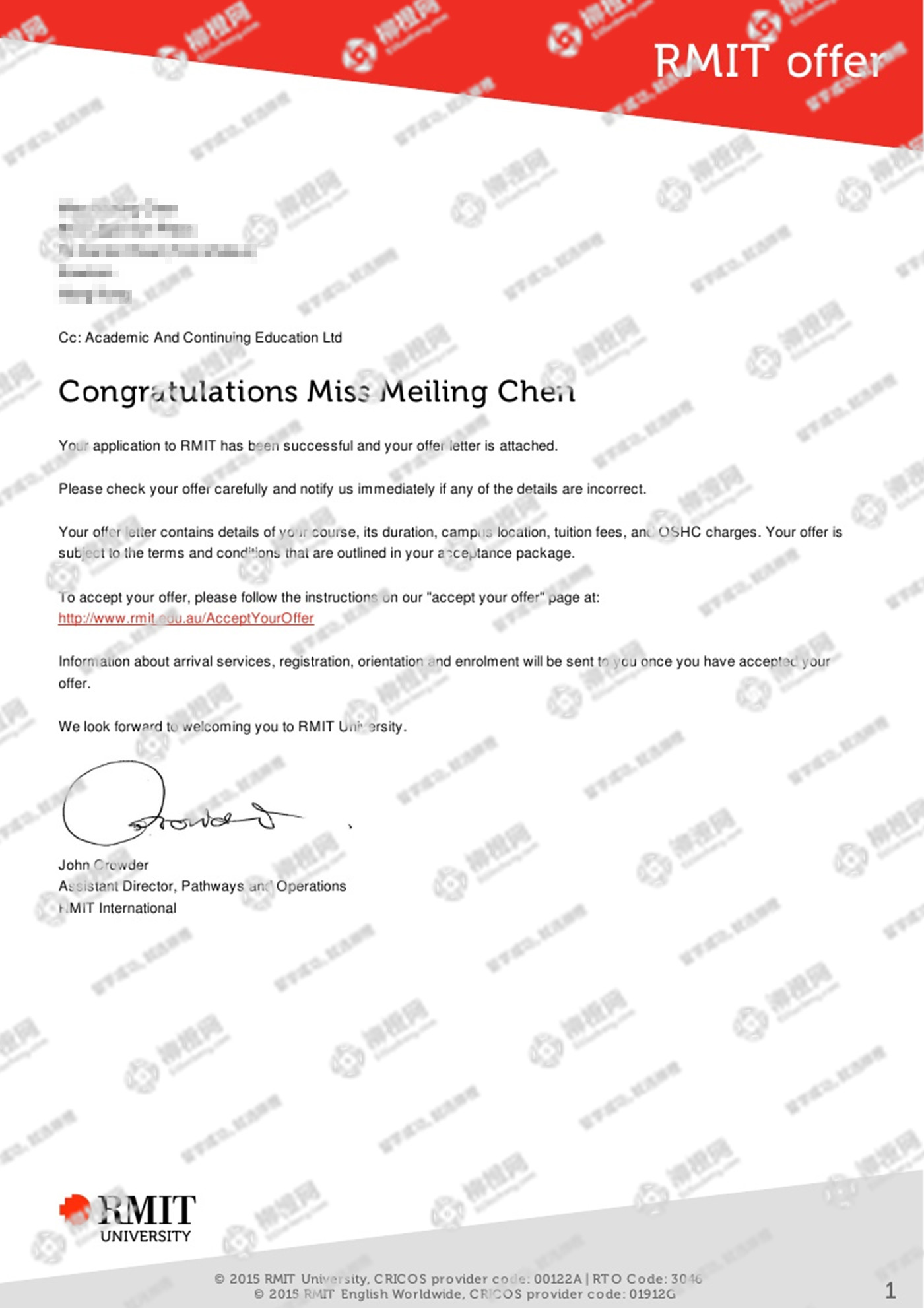 陈同学通过柳橙网办理留学服务,在柳橙网的专业协助下最终如愿拿到心仪院校offer