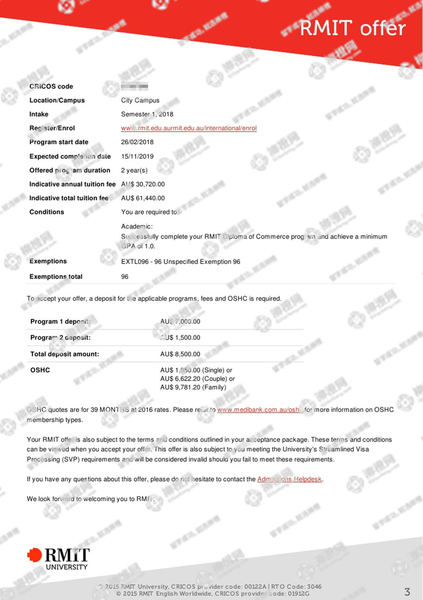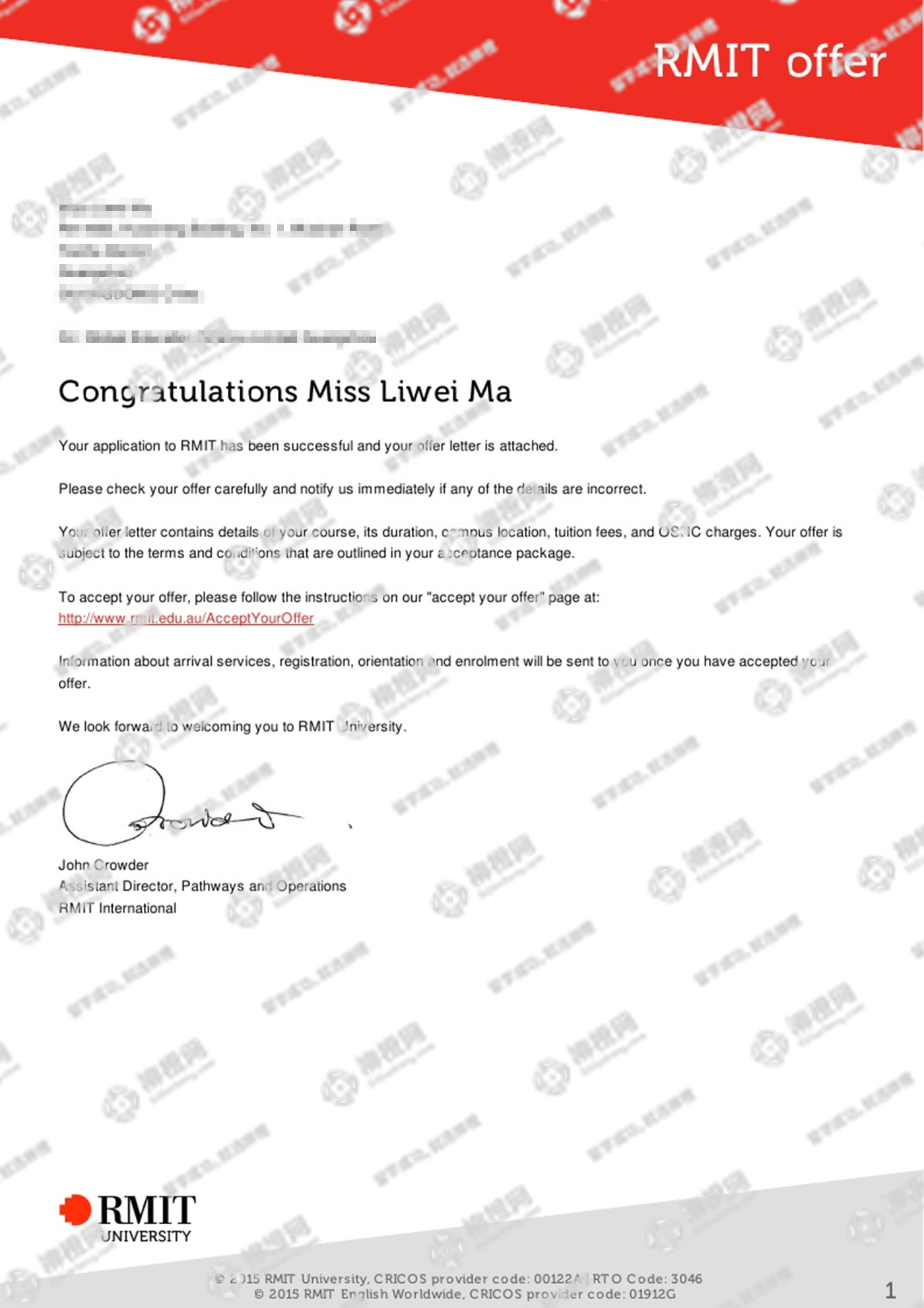 恭喜马同学获取澳洲皇家墨尔本理工大学offer
