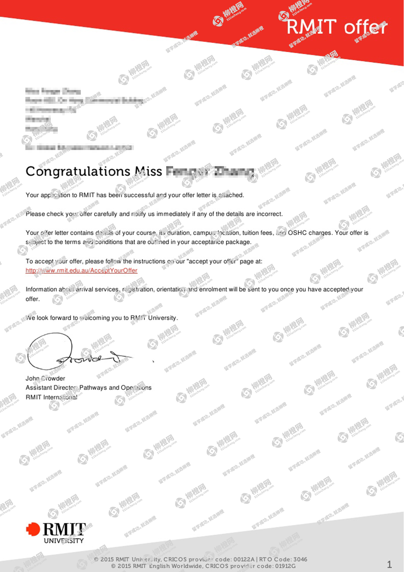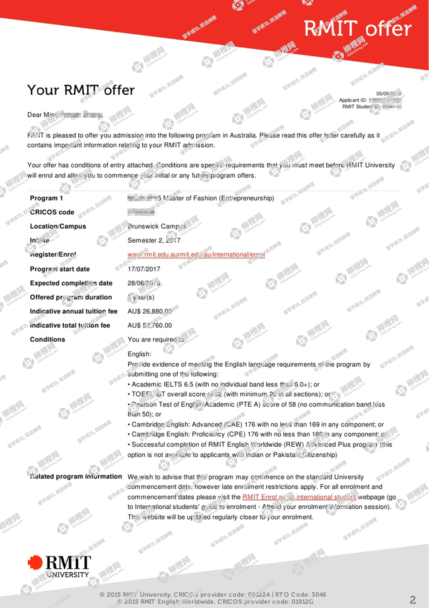 在柳橙网老师的专业指导下成功申请到了澳洲皇家墨尔本理工大学,全程高效透明,值得推荐