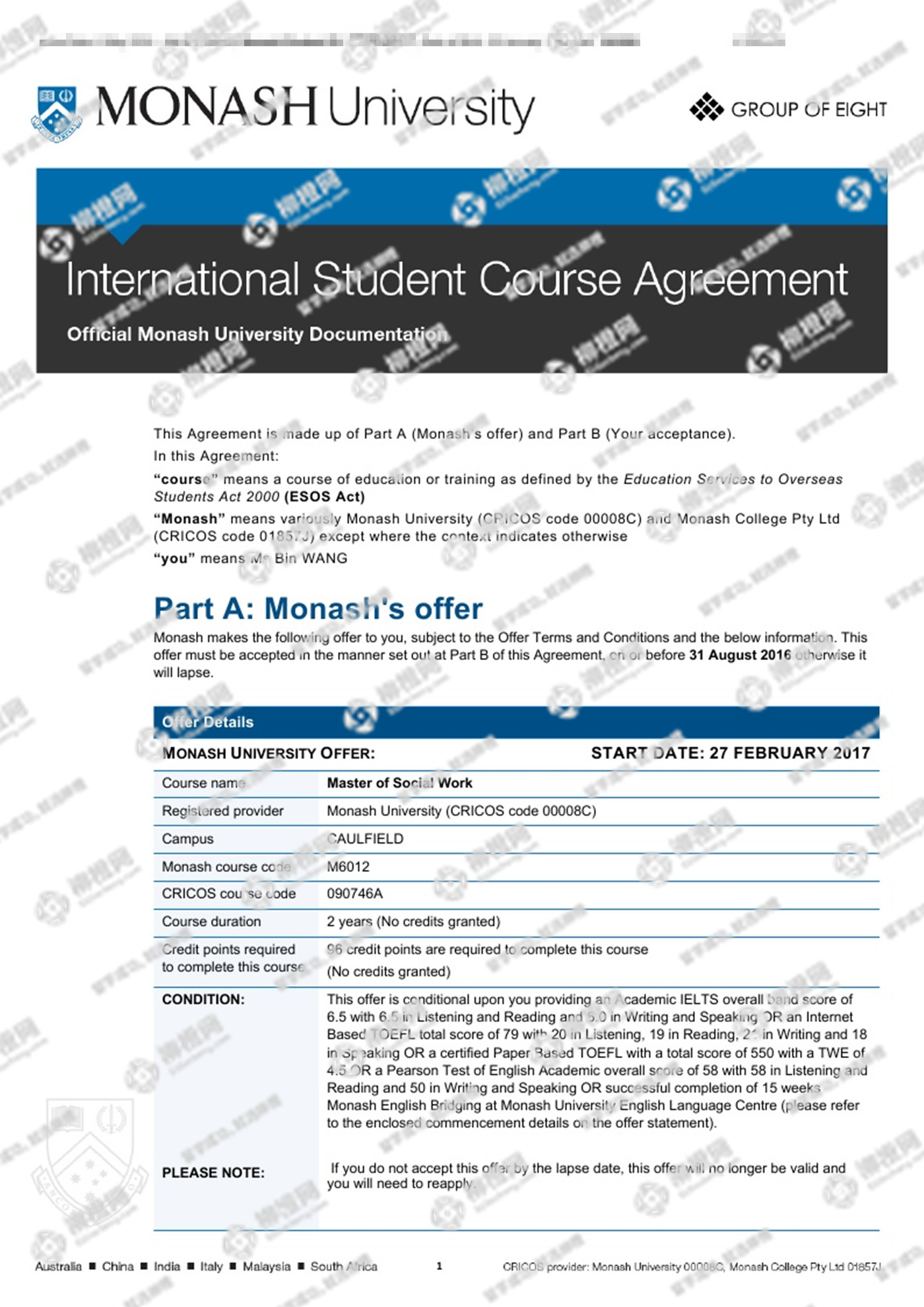 王同学,双非背景,均分85,在柳橙网专业老师的帮助下,成功拿到了莫纳什大学的offer