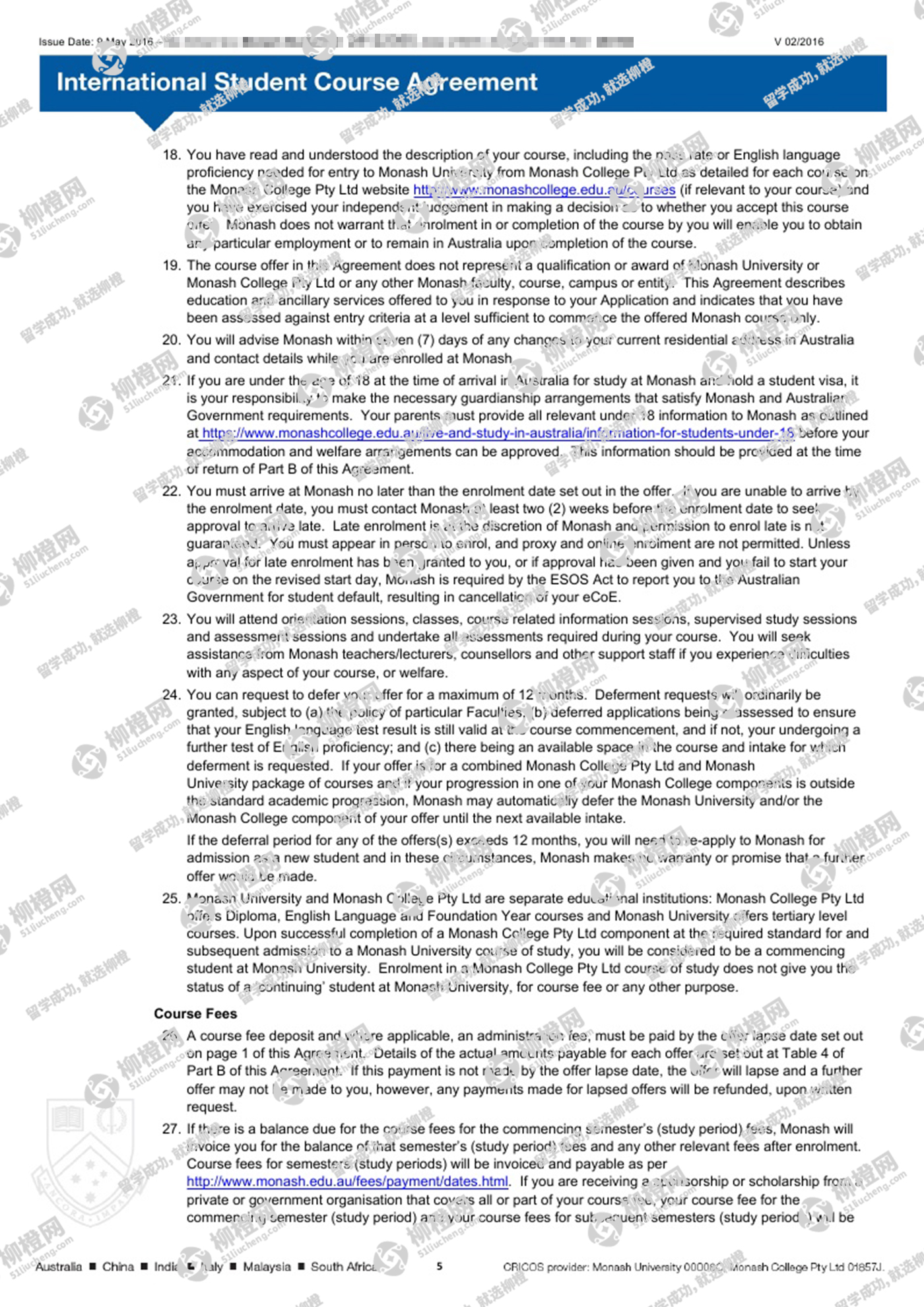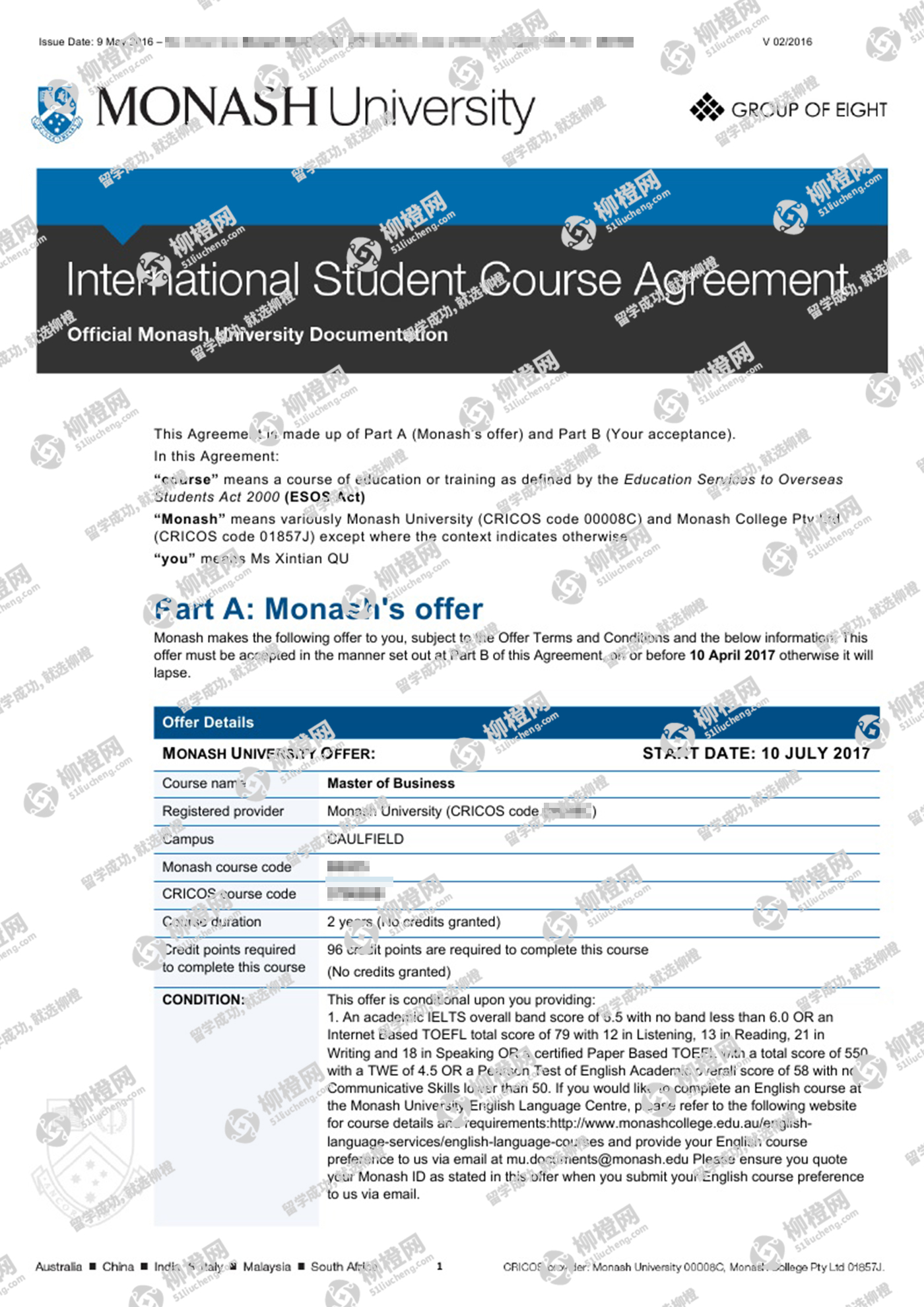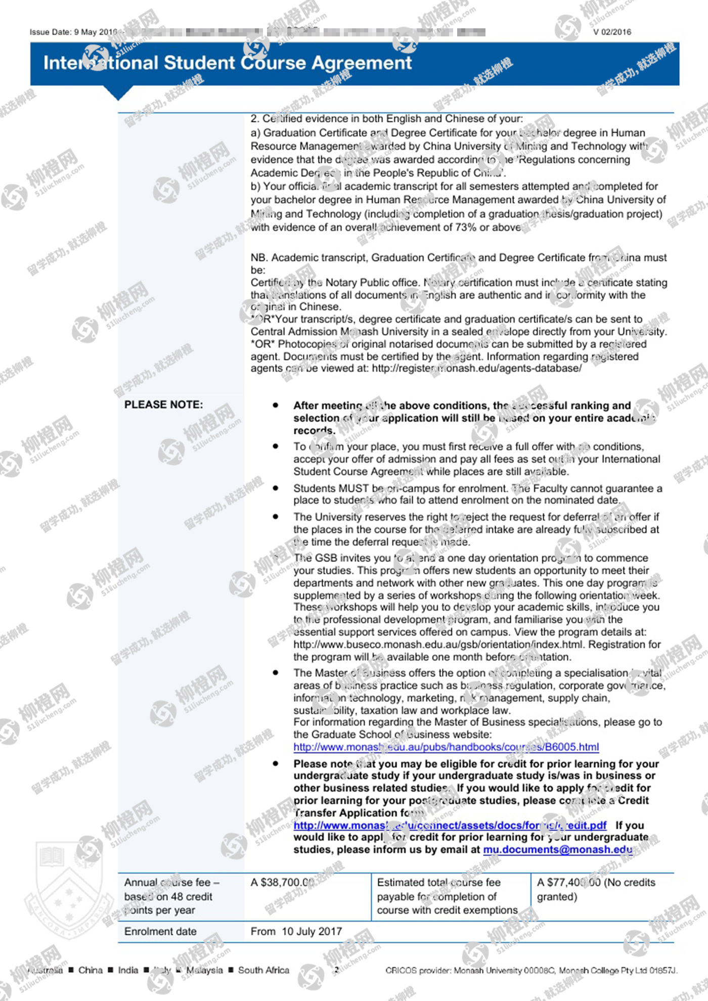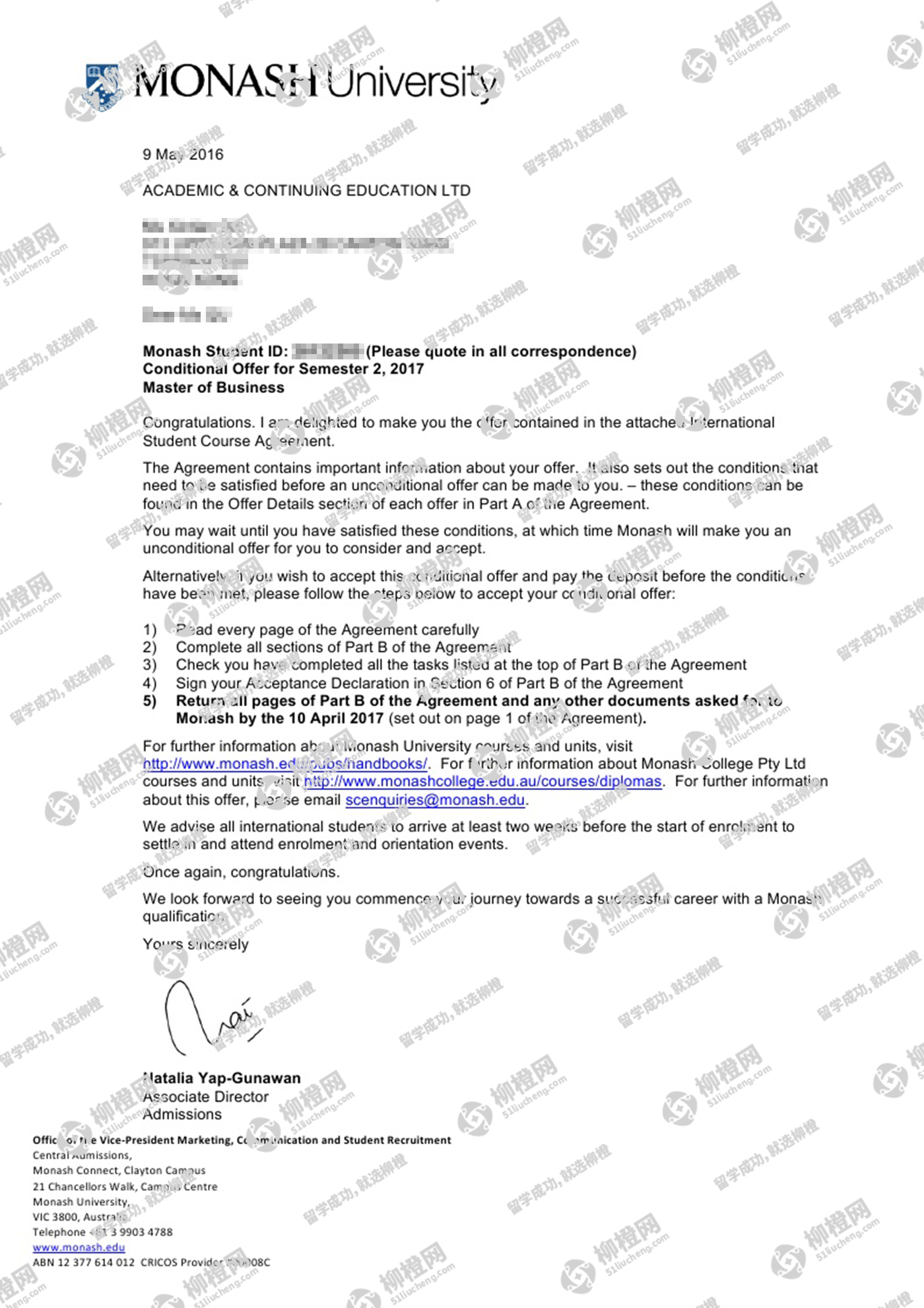 恭喜田同学获得澳洲莫纳什大学offer
