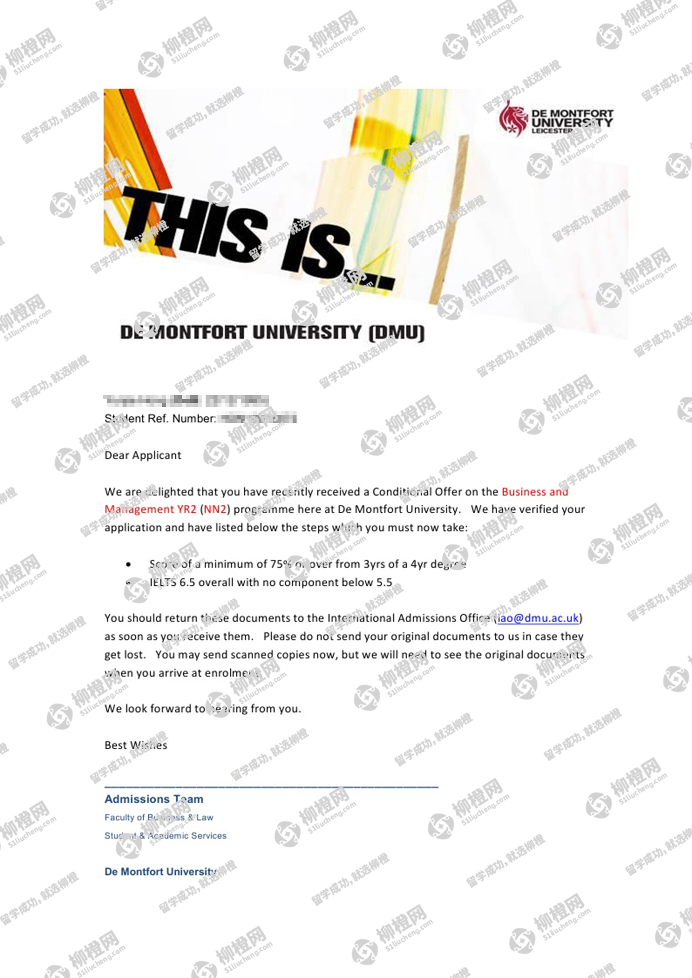 洪同学,中南林业科技大学学生,均分75,在柳橙网专业老师的帮助下,成功拿到了德蒙福特大学的offer