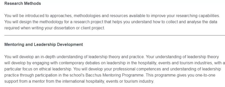 谢哈的旅游、酒店管理专业在全英排前五,课程经由IOH酒店协会、旅游管理协会TMI认证,实习地点也都是希尔顿、万豪等高大上的五星级酒店。该学院同时也是英国Association of Event Management Educators的创始机构之一。